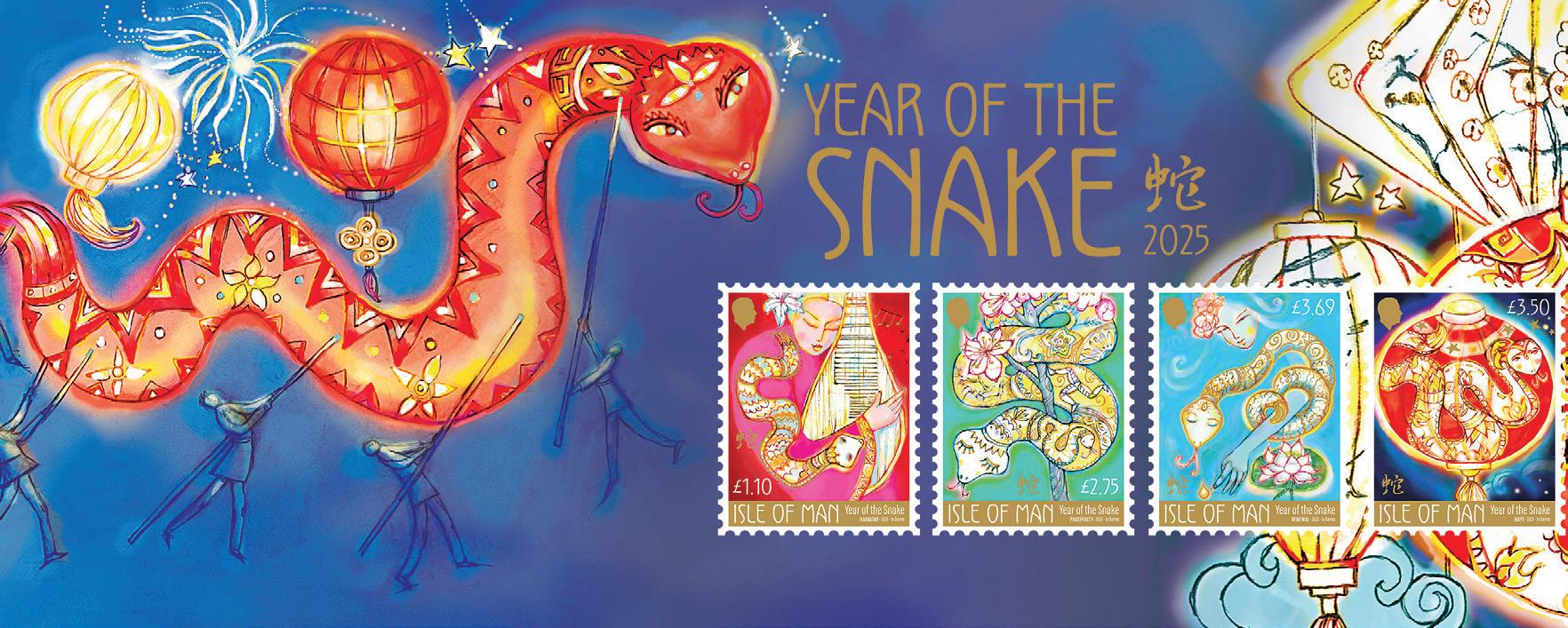 Isle of Man Post Office is delighted to celebrate the Chinese Year of the Snake with this set of four stamps beautifully illustrated by local artist Jo Davies. The 2025 Year of the Snake is the latest instalment in our ongoing series marking the Chinese Lunar New Year.