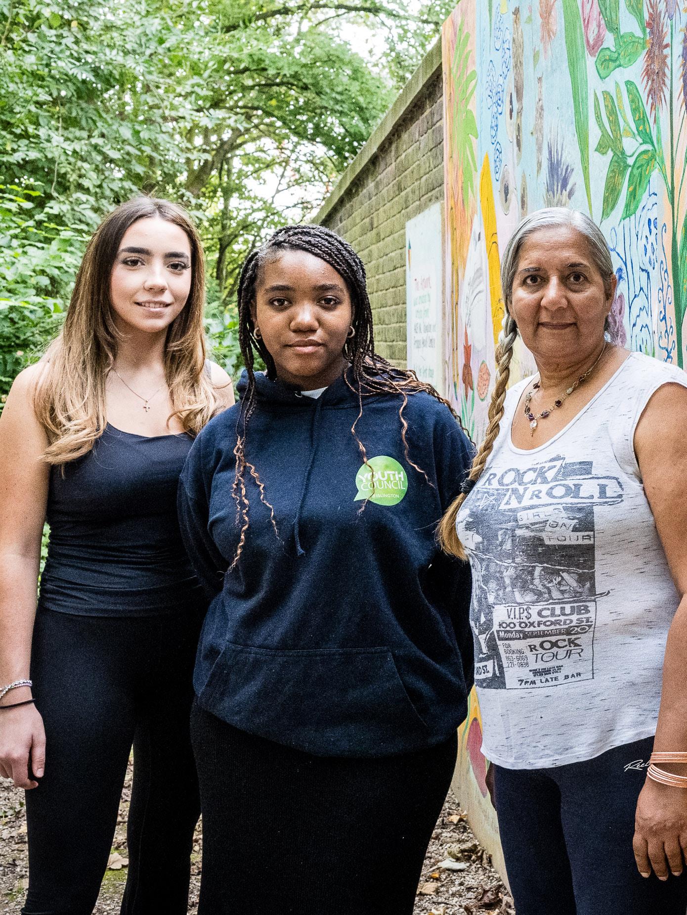 Isabella, Tyra and Rani at Caledonian Park mural, inspired by local Windrush stories