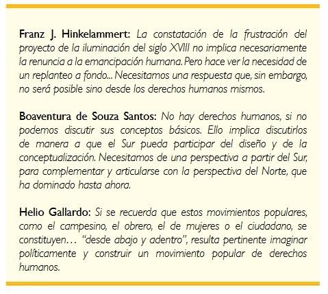 Concluyo. Para seguir avanzando en la lucha por los derechos humanos hay que seguir denunciando y criticando, y dándole a los derechos humanos la dimensión social. Que se entienda que no es solo el derecho al voto, porque si quien va a votar no tiene casa ni trabajo ni escuela ni comida, primero deberá pensar en su derecho a vivir, a alimentarse y a ser reconocido como un ser humano pleno y no como un mero votante ignorante, manipulado, embrutecido, capaz de votar por quienes lo oprimen y desprecian. Se tiene que entender que el derecho a la salud, a la educación, al trabajo, a la vivienda, a una vida digna, a un ambiente sano, a la igualdad de hombres y mujeres y a no ser discriminado por el color de piel forman un conjunto, una indisoluble totalidad, término este que los neoliberales rechazan porque temen que a partir de la visión de totalidades y relaciones de conjunto capaces de explicar realmente los fenómenos y de buscar salida a los problemas los pueblos empiecen a despertar y se rebelen.