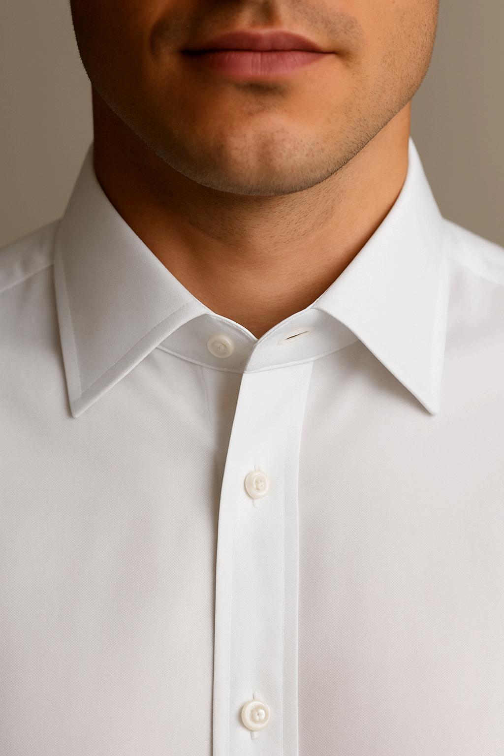 Close-up of a white dress shirt with a crisp point collar, showing how dress shirt collar stays help keep the collar flat and well-structured.