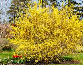 Chioma di un grande albero visto dal basso Cespuglio di forsizia in fiore
