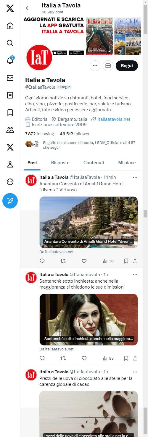 Social Platform Gennaio 2024. ITALIA A TAVOLA ITALIAN GOURMET BARGIORNALE RISTORAZIONE ITALIANA MAG. CRONACHE DI GUSTO LA MADIA TRAVELFOOD DOLCESALATO PIZZA E PASTA ITALIANA IL MONDO DELLA BIRRA MIXER PLANET SO WINE SO FOOD MARK UP FOOD&BEVERAGE ARTÙ (BARTÙ) DOLCE GIORNALE RISTORANDO FOOD - FOOD SERVICE 23.700 24.800 21.000 10.500 9.783 3.273 5.555 2.084 4.257 1.803 13.800 1.193 625 657 838184.285 78.132 40.387 29.064 27.771 23.380 17.631 12.084 11.844 11.376 7.990 6.771 4.544 3.585 3.293 890 616 46.706 1141.5551.050-8.333 1.067-9 2.000---367----