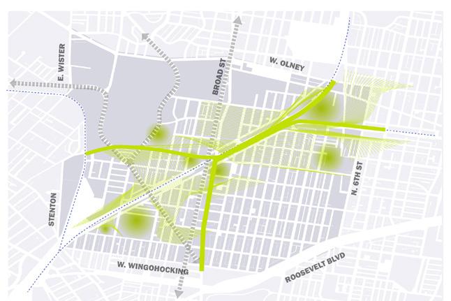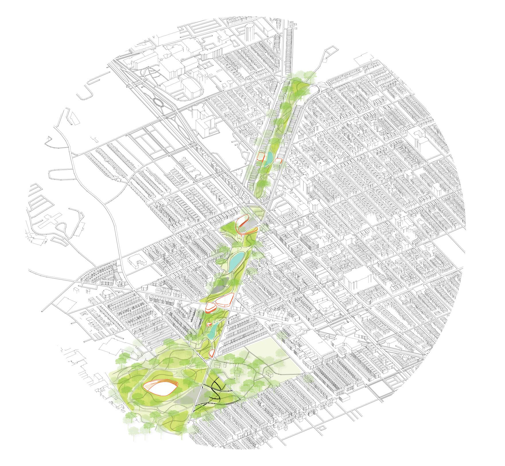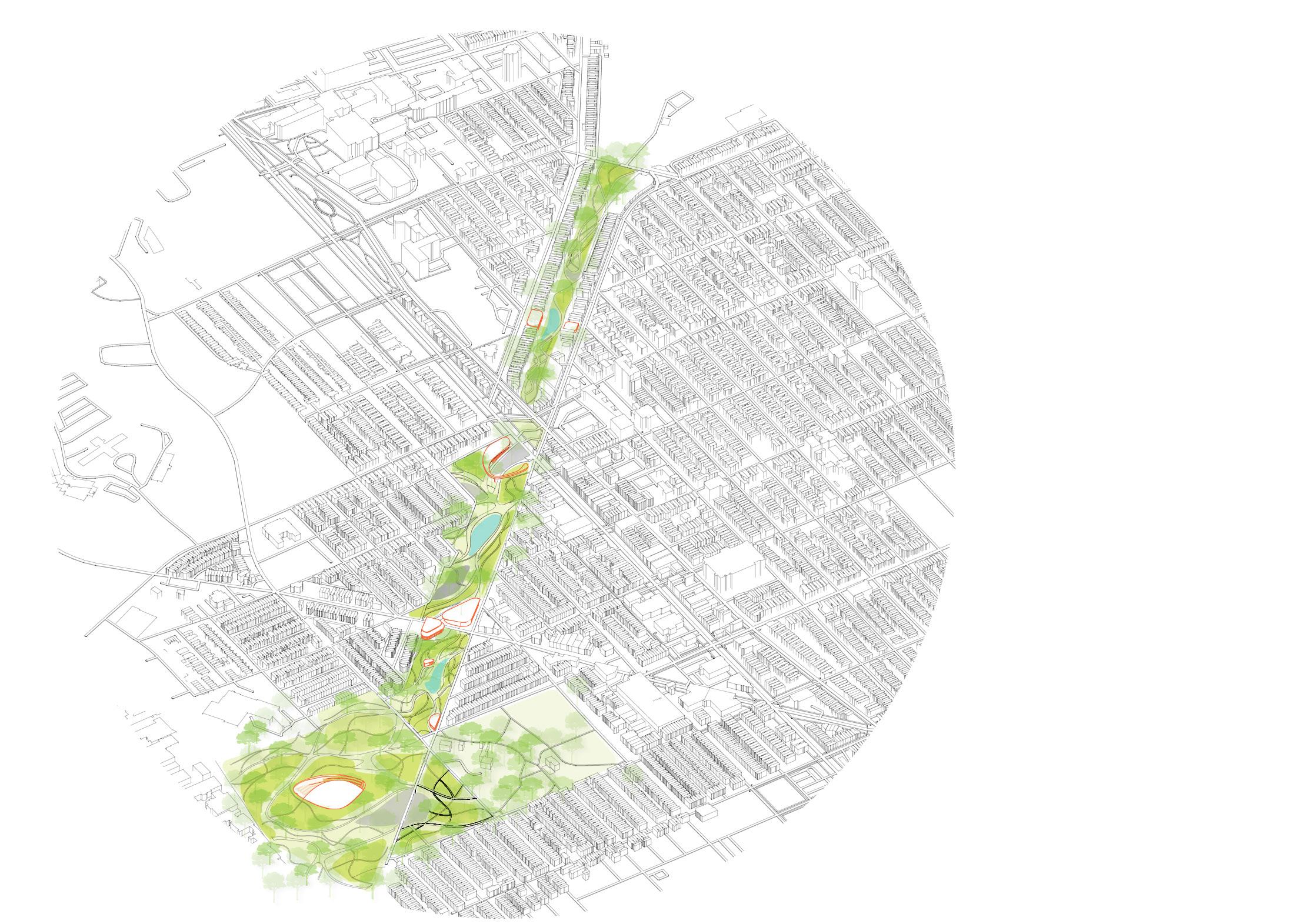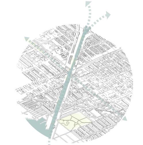 THIS STRATEGY TACKLES NEIGHBORHOOD INFRASTRUCTURE DISPARITIES, FOCUSING ON A CENTRAL MIXED-USE PATH WITH SMALLER CONNECTIONS TO OPEN SPACES.