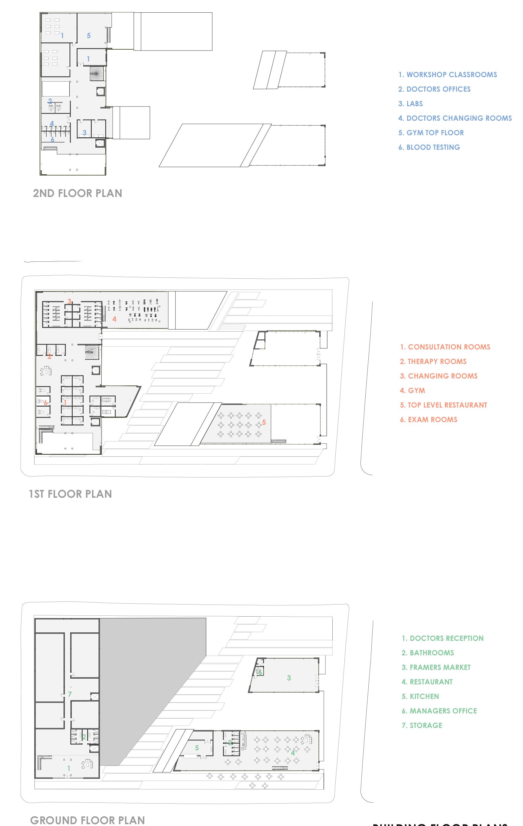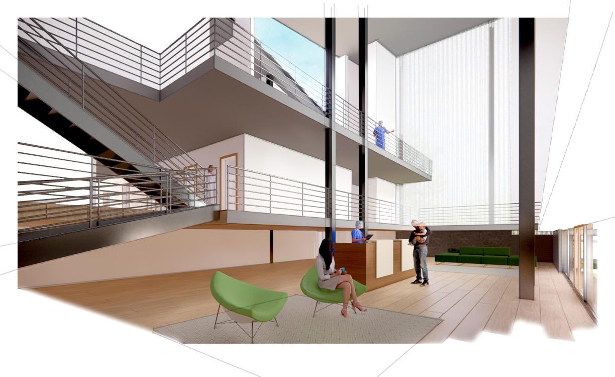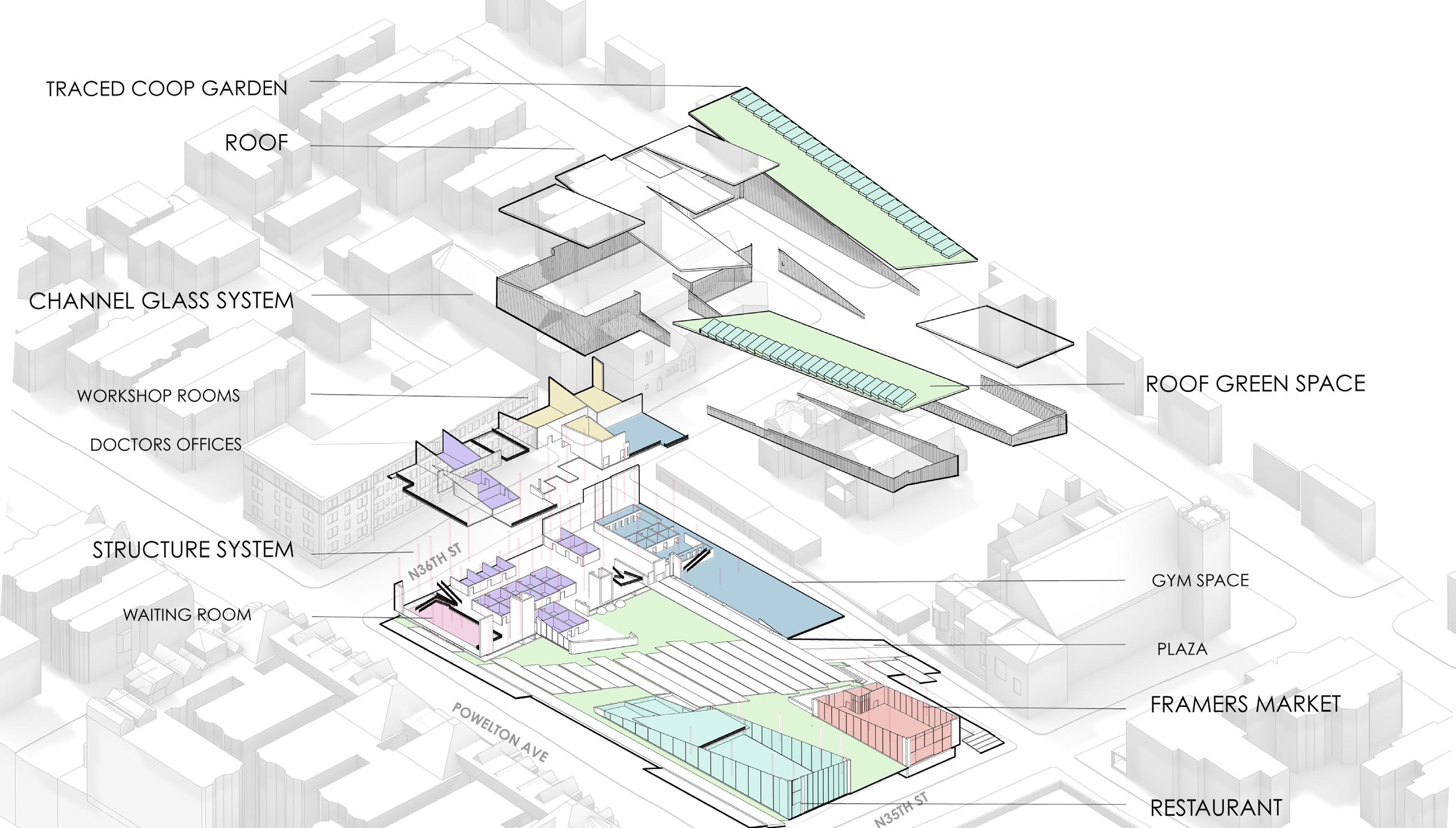 Lightbox Wellness Center defines wellness as healthy living through healthy eating and habits. It aims to eliminate the intimidation of doctors and hospitals, acting as a safe, relaxing space for physical and mental health, and ensuring the community stays healthy and active. Wellness here is about disease prevention, supported by an on-site food coop and health workshops. Located in a food desert, the center is designed with food accessibility in mind. To address the food scarcity, the program includes a coop model that aligns with the building’s ethos. The design goals are to promote a healthy life through health retention and food accessibility, using sloped roofs as interactive community gardens.
