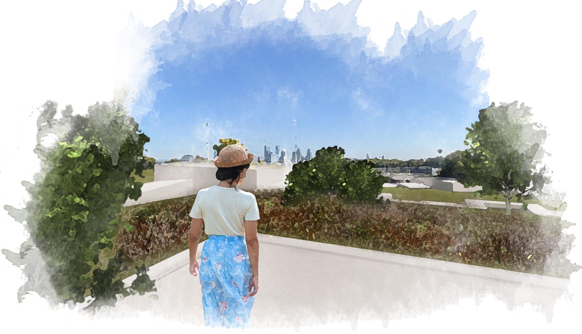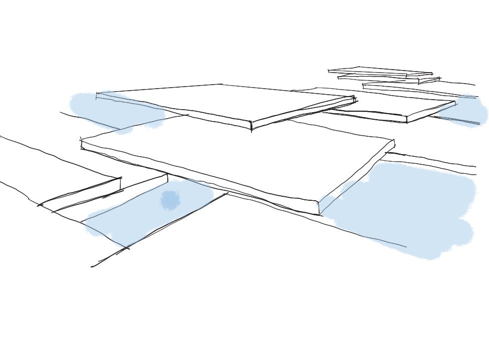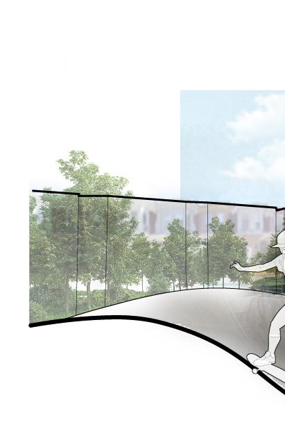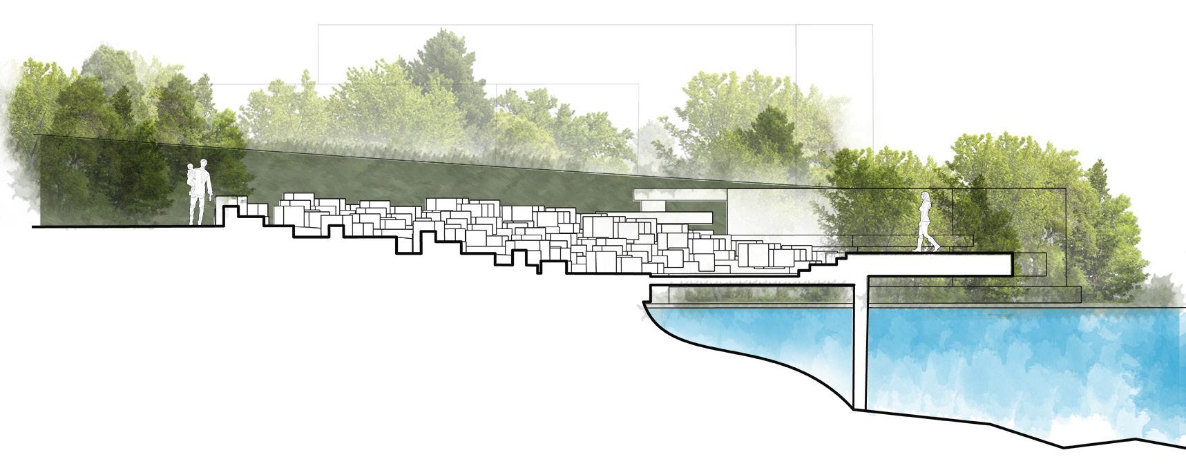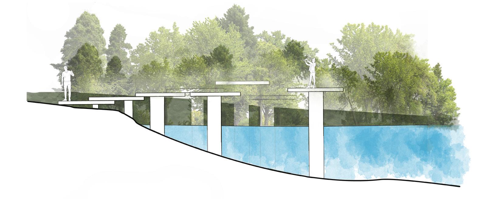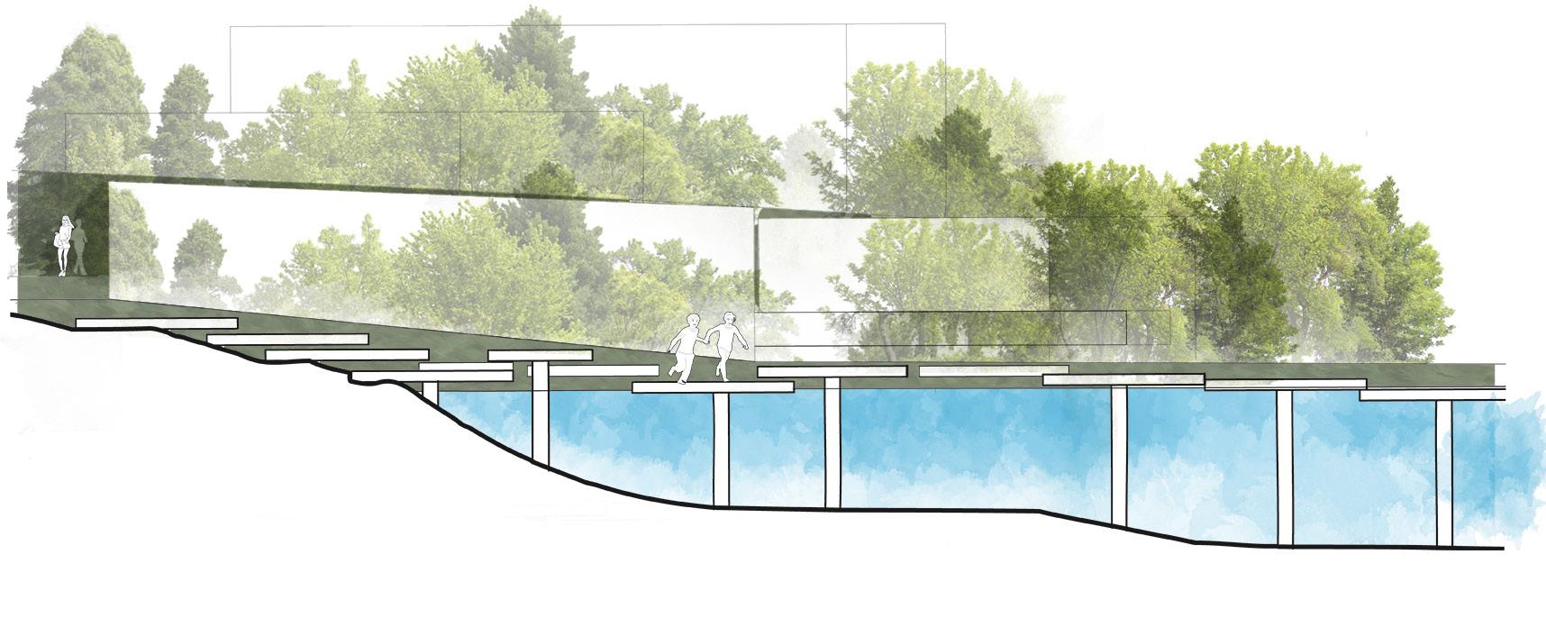 Inspired by Lawrence Halprin freeway park, the main idea is The procession or experience of the water. Through planes that are flat and seem to drift on the horizon creating a liminal space: spaces that are a strong base to float and connect to the water, Acting as New independent horizontal worlds, maintaining the strong fluid connection in the horizontal direction, where you are on a projection with uninterrupted views of the city.