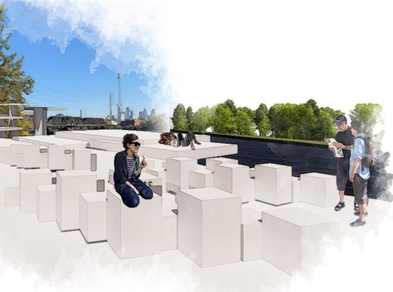 Bartram’s Garden has been a vital space for leisure, healing, and recreation, significantly impacting Philadelphia. However, its waterfront along the Schuylkill River remains underutilized, currently featuring only a fishing dock and storage containers. With its stunning city views and easy water access, the waterfront has immense potential. Our plan, based on wind and flood pattern analysis, aims to activate this area while preserving the main connecting paths. The design focuses on creating a compression and expansion effect, with a composition of planes and independent spaces that flow into each other. This culminates in a path sequence that gradually reveals the main experience as visitors approach the water, offering them the choice to engage from various elevations. This re-imagined waterfront will provide spaces that reconnect visitors with the water’s edge, whether experienced individually or communally.