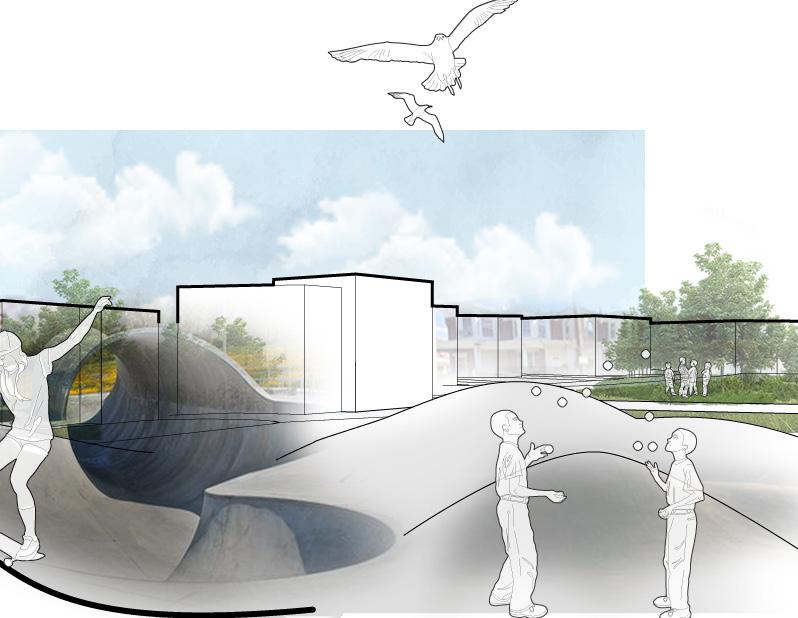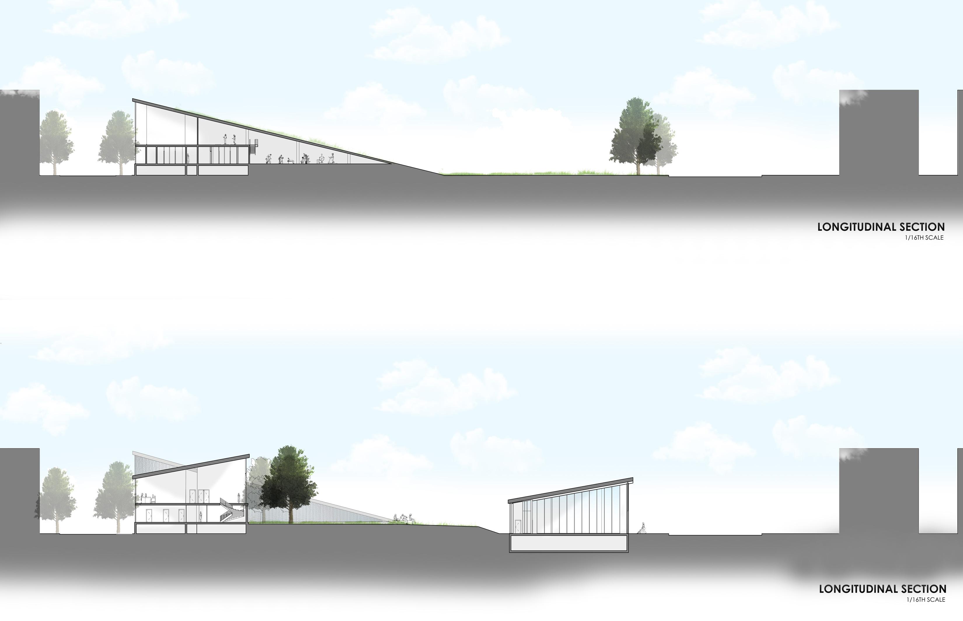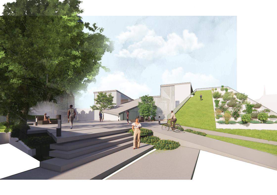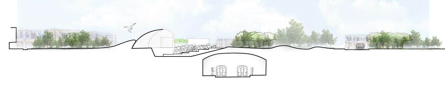 The lawns sculpt open spaces, shaped by the ground to host diverse programs. The ground unfolds, creating engaging spaces that contribute to a dynamic and distinctive environment.