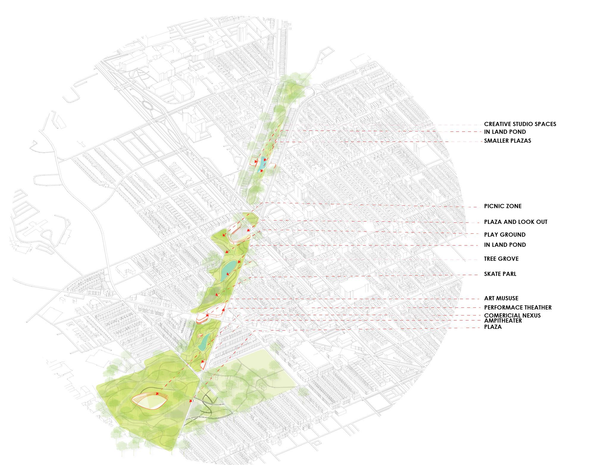 The project involves transforming the existing rail lines into underground passages, reclaiming space for community use. It includes developing vibrant public areas and cultural centers, catering to diverse activities and providing spaces for youth expression. A central transportation hub will enhance connectivity within the neighborhood and integrate with existing infrastructure. The initiative also addresses infrastructure disparities, supports education, and improves pedestrian and cyclist connectivity, fostering community engagement and creating a vibrant neighborhood environment.