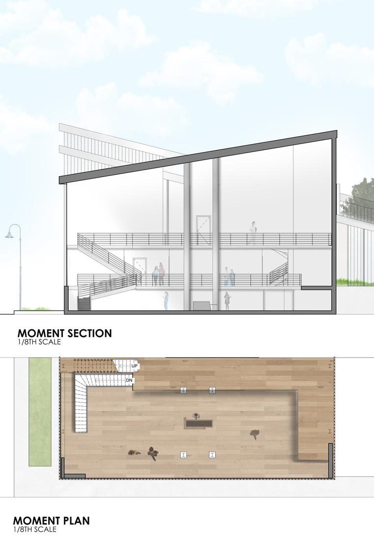 The section are cut to show the retaliation between ground and building, they meet and the spaces and experiences they created. They create spaces that are very considerate of the original but all wide and open with pocket of light and air coming through with spilling into the ground. The moments isolate large spaces that create community and illustrate the experience of the big moves.
