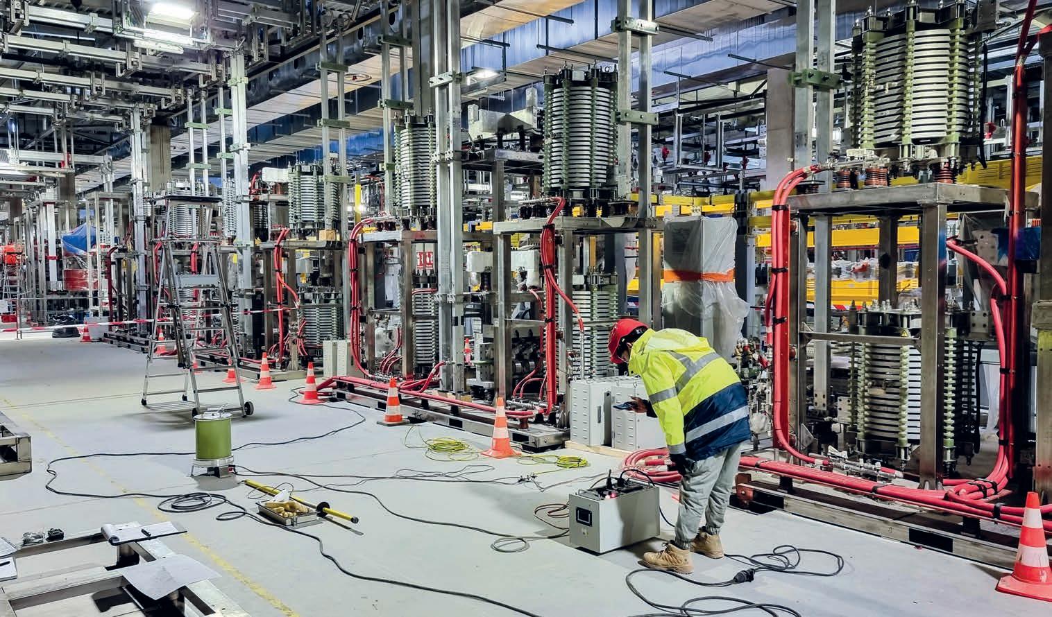 As contractors complete the installation of reactive power compensation and harmonic filtering equipment from China, the focus turns to testing. These 8-metre-tall thyristor-controlled reactors are the first to be energized and put through their paces. April 2021