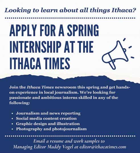 THE ENTIRE CONTENTS OF THE ITHACA TIMES ARE COPYRIGHT © 2026 BY PATHWAYS TO EQUITY, LLC. All rights reserved. Events are listed free of charge in TimesTable. All copy must be received by Friday at noon. The Ithaca Times is available free of charge from various locations around Ithaca. Additional copies may be purchased from the Ithaca Times offices for $1. SUBSCRIPTIONS: $139 one year. Include check or money order and mail to the Ithaca Times, PO Box 27, Ithaca, NY 14851. ADVERTISING: Deadlines are Monday 5 p.m. for display, Tuesday at noon for classified. Advertisers should check their ad on publication. The Ithaca Times will not be liable for failure to publish an ad, for typographical error, or errors in publication except to the extent of the cost of the space in which the actual error appeared in the first insertion. The publisher reserves the right to refuse advertising for any reason and to alter advertising copy or graphics deemed unacceptable for publication. The Ithaca Times is published weekly Wednesday mornings. Offices are located at 109 N. Cayuga Street, Ithaca, NY 14850 607-277-7000, FAX 607277-1012, MAILING ADDRESS is PO Box 27, Ithaca, NY 14851. The Ithaca