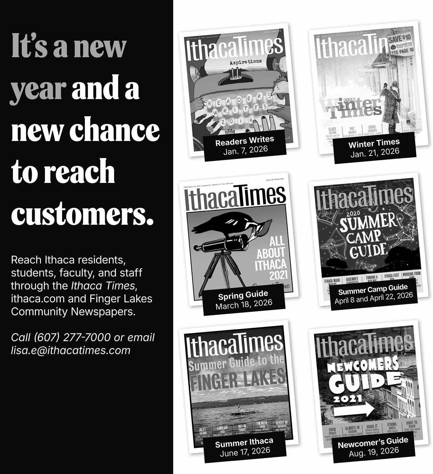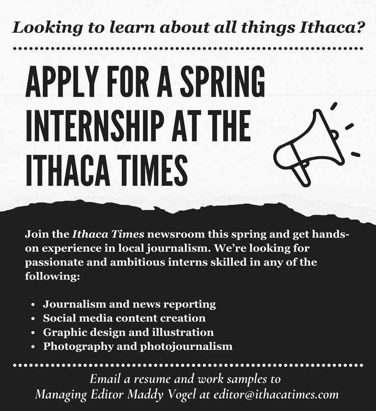 f r EE lanc E rs : Barbara Adams, Charley Githler, Stephen Burke, Bill Chaisson, Ross Haarstad, Steve Lawrence, Marjorie Olds, Peter Rothbart, Austin Lamb, Clement Obropta, Jake Sexton, Kira Walter, Vasant Alex Laplam, and Ceili Ayoung THE ENTIRE CONTENTS OF THE ITHACA TIMES ARE COPYRIGHT © 2026 BY PATHWAYS TO EQUITY, LLC. All rights reserved. Events are listed free of charge in TimesTable. All copy must be received by Friday at noon. The Ithaca Times is available free of charge from various locations around Ithaca. Additional copies may be purchased from the Ithaca Times offices for $1. SUBSCRIPTIONS: $139 one year. Include check or money order and mail to the Ithaca Times, PO Box 27, Ithaca, NY 14851. ADVERTISING: Deadlines are Monday 5 p.m. for display, Tuesday at noon for classified. Advertisers should check their ad on publication. The Ithaca Times will not be liable for failure to publish an ad, for typographical error, or errors in publication except to the extent of the cost of the space in which the actual error appeared in the first insertion. The publisher reserves the right to refuse advertising for any reason and to alter advertising copy or graphics deemed unacceptable for publication. The Ithaca Times is published weekly Wednesday mornings. Offices are located at 109 N. Cayuga Street, Ithaca,