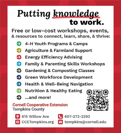 THE ENTIRE CONTENTS OF THE ITHACA TIMES ARE COPYRIGHT © 2025 BY PATHWAYS TO EQUITY, LLC. All rights reserved. Events are listed free of charge in TimesTable. All copy must be received by Friday at noon. The Ithaca Times is available free of charge from various locations around Ithaca. Additional copies may be purchased from the Ithaca Times offices for $1. SUBSCRIPTIONS: $139 one year. Include check or money order and mail to the Ithaca Times, PO Box 27, Ithaca, NY 14851. ADVERTISING: Deadlines are Monday 5 p.m. for display, Tuesday at noon for classified. Advertisers should check their ad on publication. The Ithaca Times will not be liable for failure to publish an ad, for typographical error, or errors in publication except to the extent of the cost of the space in which the actual error appeared in the first insertion. The publisher reserves the right to refuse advertising for any reason and to alter advertising copy or graphics deemed unacceptable for publication. The Ithaca Times is published weekly Wednesday mornings. Offices are located at 109 N. Cayuga Street, Ithaca, NY 14850 607-277-7000, FAX 607277-1012, MAILING ADDRESS is PO Box 27, Ithaca, NY 14851. The Ithaca Times was preceded by the Ithaca New Times (1972–1978) and The