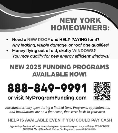 YOU MAY QUALIFY THROUGH NEW RELIEF PROGRAMS (800) 944-9393 or visit NYProgramFunding.org to qualify. Approved applications will have the work completed by a repair crew provided by: HOMEOWNER FUNDING. Not affiliated with State or Gov Programs. (NYSCAN)