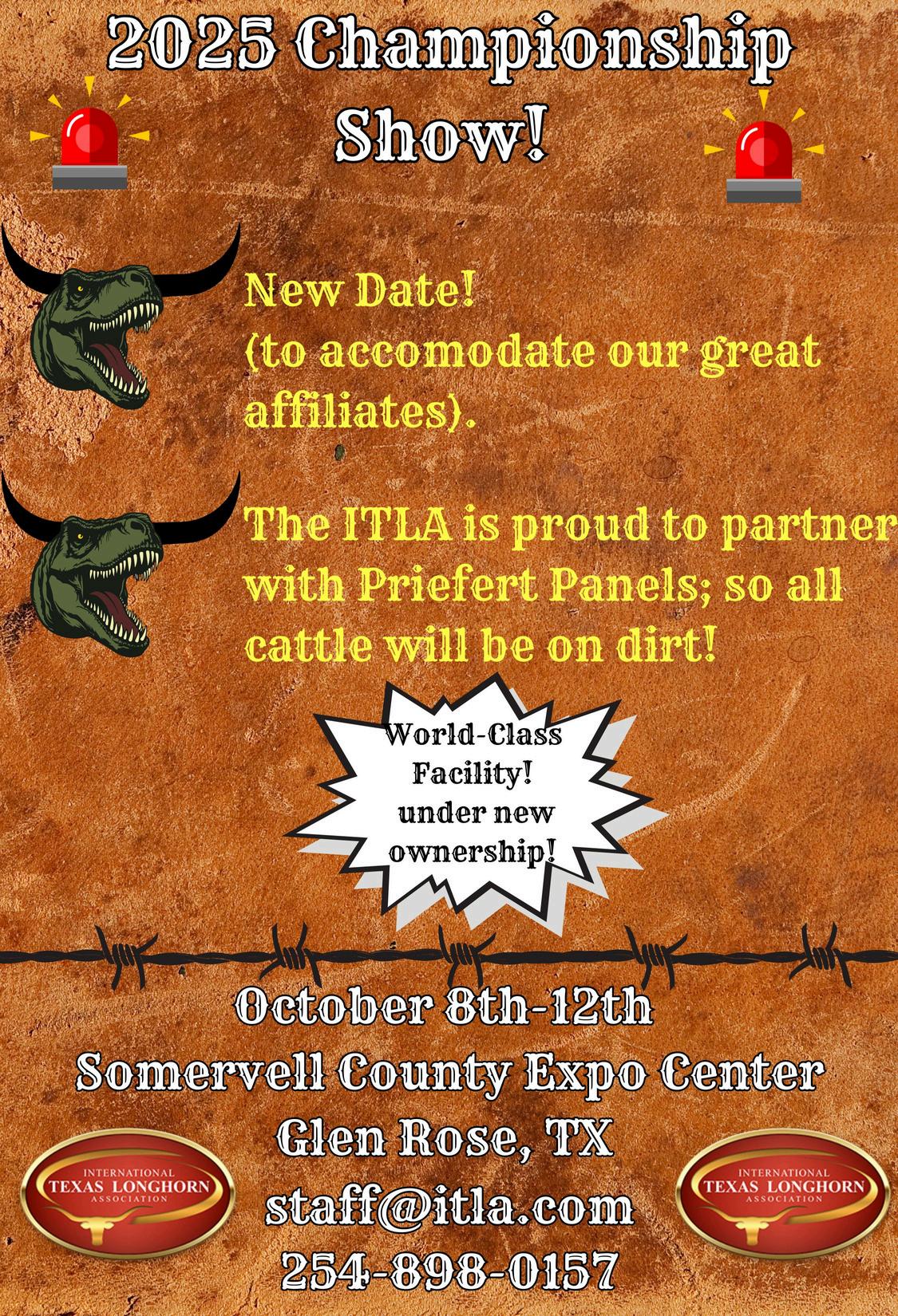 A: First, please note that it will now be held on October 8-12, a date better suited to accommodate each of our wonderful Affiliates In celebration of the ITLA’s 35 th Anniversary, this year’s Show and Convention will be one to remember; and we’re going to do it in style! The Expo in Glen Rose is now privately owned. It was already a very nice facility, but with the upgrades the new owners are already implementing it will be a fantastic venue to rival any in the southwest by showtime We are also very pleased to announce the ITLA’s partnership with Priefert Panels, which is graciously providing all the cattle panels that we need for our Show. That means that our beautiful Longhorns will be housed on soft dirt in covered arenas. And of course, having the Show in Glen Rose will allow our members the opportunity to tour the only owned Headquarters in the Longhorn industry and what a beautiful Headquarters it is In the weeks to come, keep a watch on social media and your email for more exciting news about what promises to be an epic Show and Convention. You will NOT want to miss it!