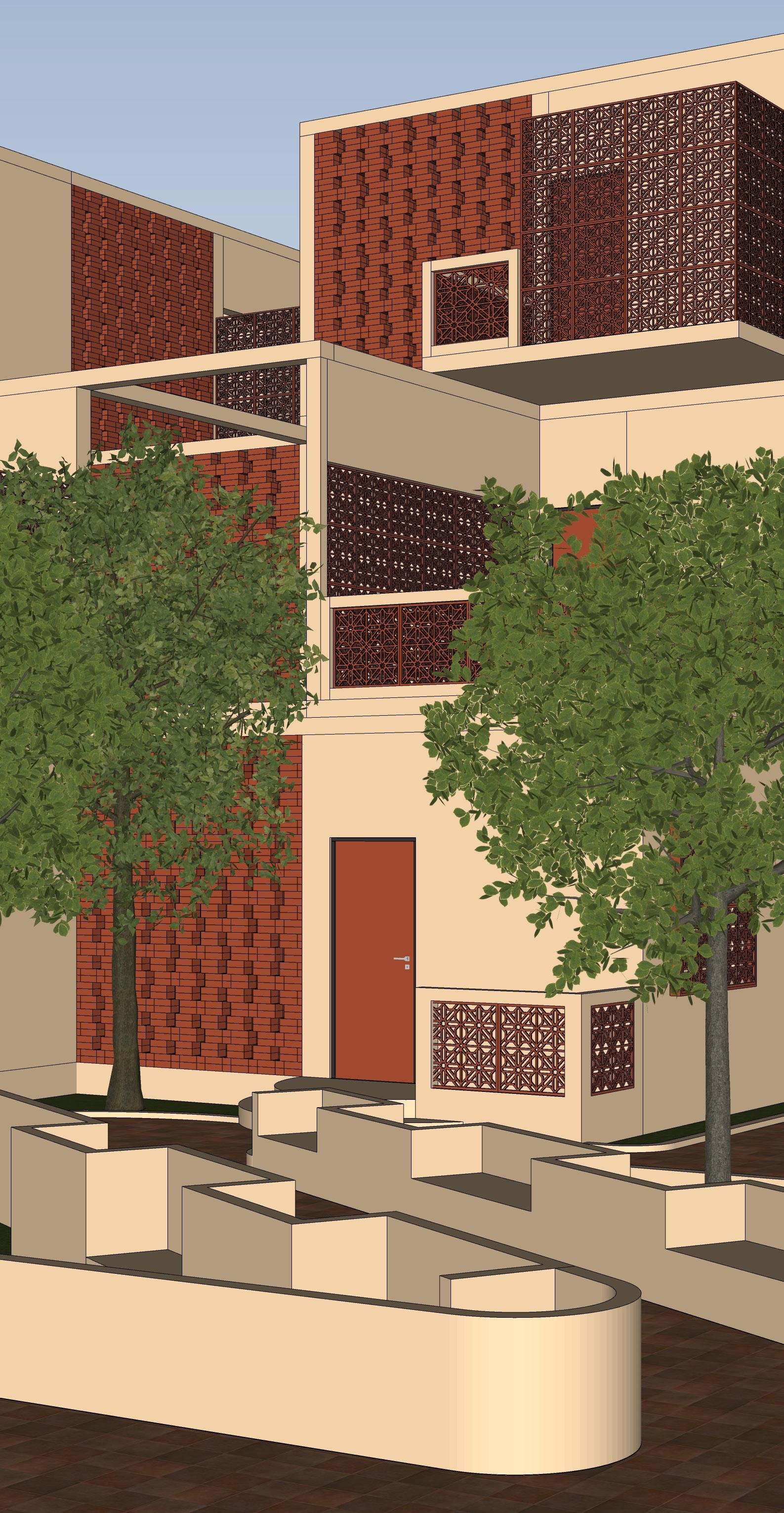 As the name of the intervention * Sammilan * suggests, the intend is to establish a connection between different communities, between people and nature, between vernacular and modern, between work and leisure, through housing thus becoming a connective tissue. The idea is to create a prototype tor housing which could be replicated in the such type of rich residential neighbourhood, so that more number of these people can be accommodated with in the city itself, providing them with better opportunities and resources to live a better lifestyle, unlike the present government schemes. To connect people from different background as an extended family. The idea is to create junctions to bring the residents together to organize social meetings and leisure activities.