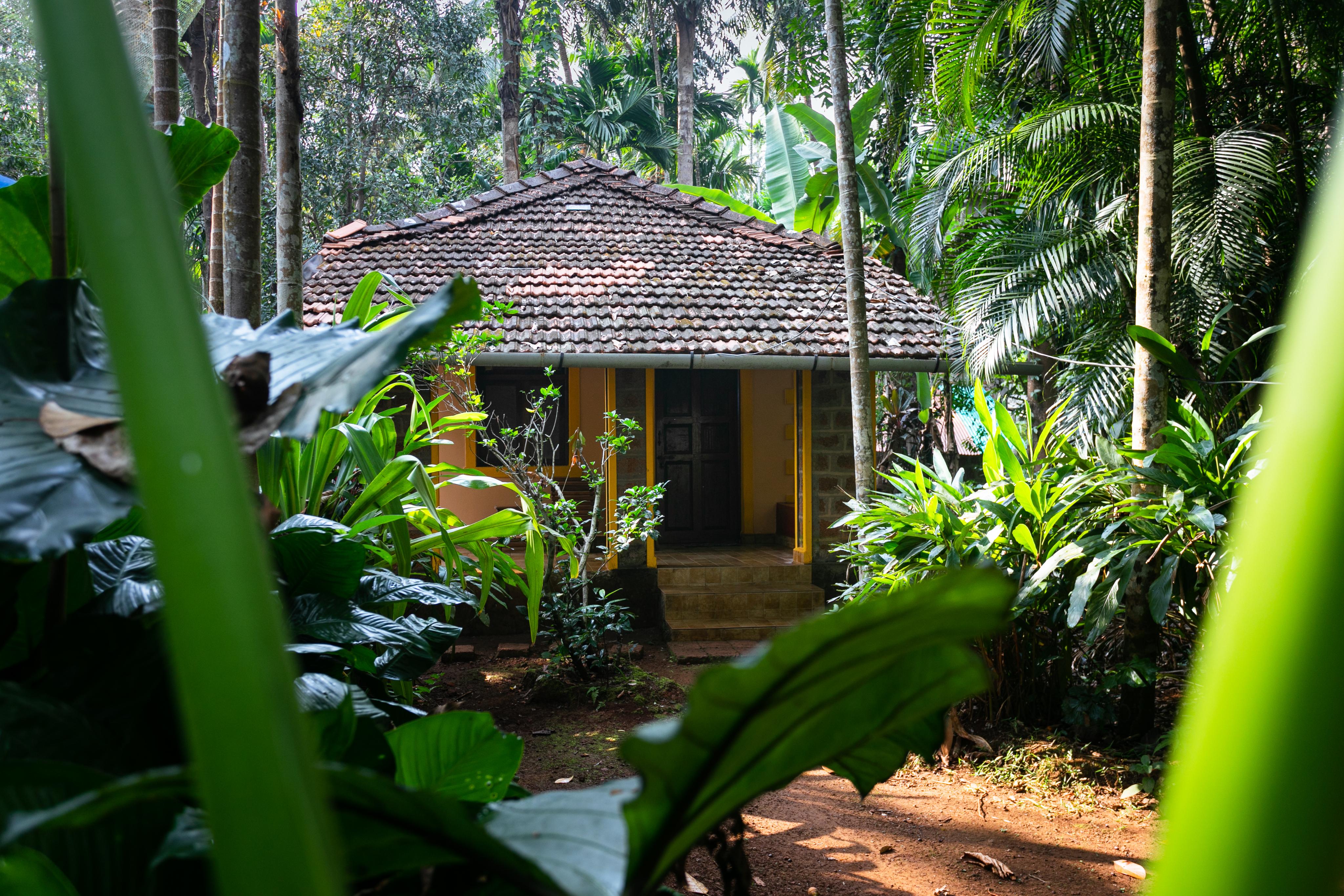 Spread across fifty acres at the foothills of the biodiverse Western Ghats, the plantation itself resembles a vibrant food forest. Guests stay in five independent cottages nestled within coconut groves and surrounded by tropical vegetation rich with birds and butterflies.