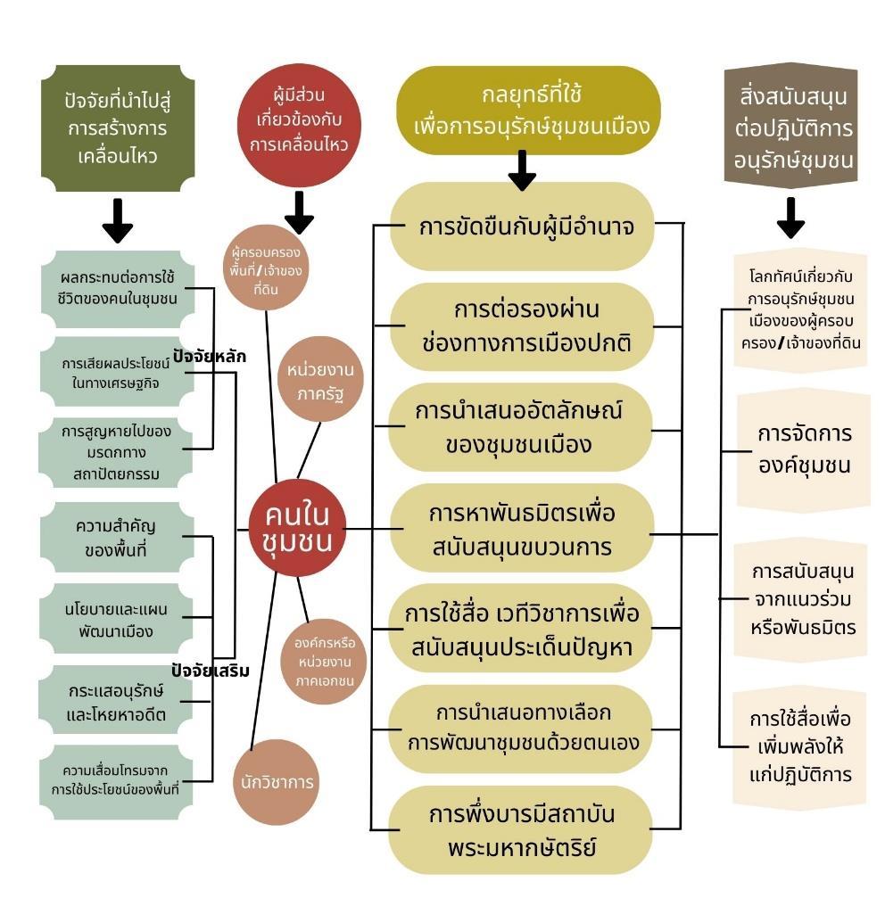 จากปัจจัยดังกล่าวโดยเฉพาะปัจจัยหลัก คือ ผลกระทบต่อการใช้ชีวิตของคนในชุมชน การเสียผลประโยชน์ ในทางเศรษฐกิจ และการสูญหายไปของมรดกทางสถาปัตยกรรม ถือเป็นแรงผลักดันสาคัญที่ทาให้เกิดการรวมตัว ของคนในชุมชนเพื่ออนุรักษ์ชุมชนเมือง เพื่อต่อต้านการเปลี่ยนแปลงจากภายนอก และยังสามารถอธิบายได้ด้วย ปัจจัยเสริม ได้แก่ ความสาคัญของพื้นที่ นโยบายและแผนพัฒนาเมือง กระแสการอนุรักษ์โหยหาอดีต รวมทั้งความ เสื่อมโทรมจากการใช้ประโยชน์ของพื้นที่ นับเป็นเงื่อนไขสนับสนุนที่ทาให้ผู้ครอบครองพื้นที่/เจ้าของที่ดินวางแผนที่ จะพัฒนาชุมชนเมืองในรูปแบบของโครงการพัฒนา ปรับปรุง ฟื้นฟูลักษณะทางกายภาพของชุมชนให้มีความ เหมาะสม ส่งผลโดยตรงต่อผู้ใช้พื้นที่ในปัจจุบันทั้งในด้านการใช้ชีวิต การประกอบอาชีพ การดารงอยู่ของ ความสัมพันธ์ทางเศรษฐกิจและสังคมในพื้นที่ชุมชนเมือง ทาให้เกิดการรวมตัวกันในรูปแบบองค์กร