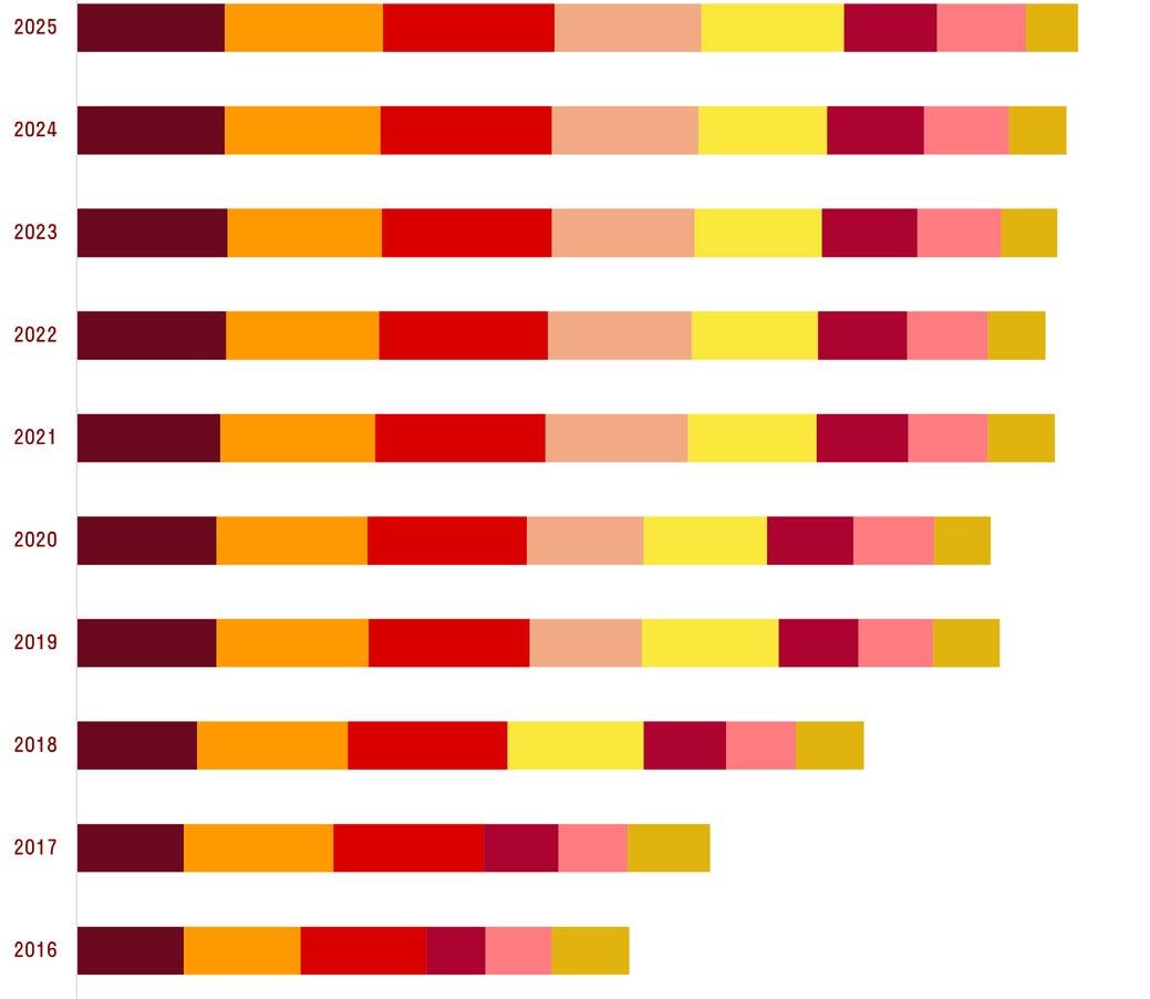 Aus dem diesjährigen Index geht eine erhebliche und sich weiter verschärfende weltweite Krise für arbeitende Menschen und Gewerkschaften hervor. Im Jahr 2025 haben sich die durchschnittlichen Länderratings in drei von fünf Regionen verschlechtert, wobei Europa und Gesamtamerika die schlechteste Bewertung seit der Einführung des Index im Jahr 2014 erhielten. Erschreckenderweise haben nur sieben der 151 untersuchten Länder die Bestnote erhalten. Die Daten zeigen eine starke Eskalation der Verletzungen grundlegender Rechte, einschließlich des Zugangs zur Justiz, des Rechtes auf Rede- und Versammlungsfreiheit sowie des Rechtes auf Tarifverhandlungen.