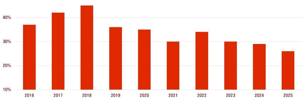 Obwohl Europa im Durchschnitt nach wie vor die am wenigsten repressive Region für arbeitende Menschen ist, hat sich die Lage im Verlauf der letzten vier Jahre doch kontinuierlich verschlechtert. Das Durchschnittsrating hat sich von 2,73 im Jahr 2024 auf 2,78 verschlechtert, das schlechteste Ergebnis seit Beginn des Index. In 52% der Länder hatten Beschäftigte keinen oder nur begrenzten Zugang zur Justiz, ein drastischer Anstieg gegenüber 32% im Jahr 2024.