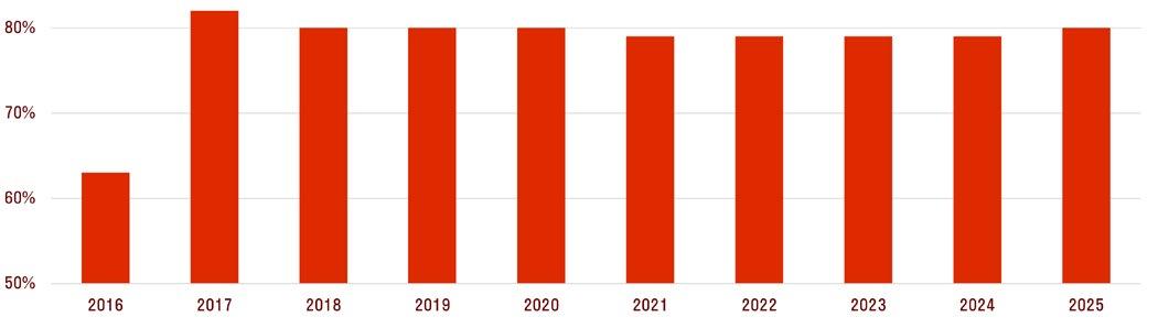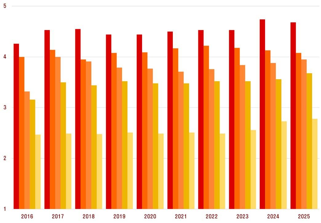 Mit einem durchschnittlichen Rating von 4,08 gegenüber 4,13 im Jahr 2024 hat die Region Asien/Pazifik zum dritten Mal in Folge eine geringfügige Verbesserung zu verzeichnen. Die Zahl der an Beschäftigten begangenen Gewalttaten hat sich jedoch fast verdoppelt, und die Rede- und Versammlungsfreiheit wurde in mehr Ländern unterbunden.