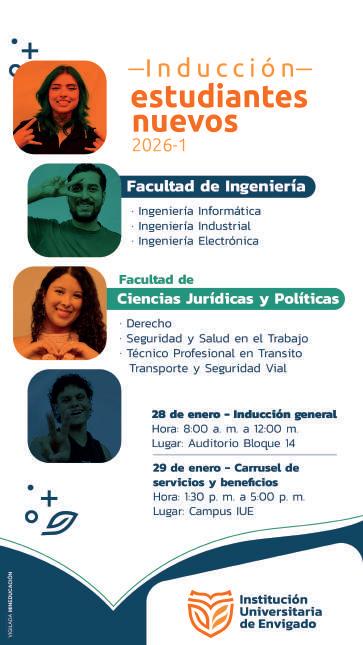Como parte de este proceso, los estudiantes participarán en una jornada de inducción, que se realizará los días 28 y 29 de enero, a partir de las 8:00 a. m., un espacio diseñado para acompañarlos en su llegada a la vida universitaria. Docentes y administrativos estaremos dispuestos a abrir las puertas de esta gran casa y a darles una bienvenida desde el corazón.