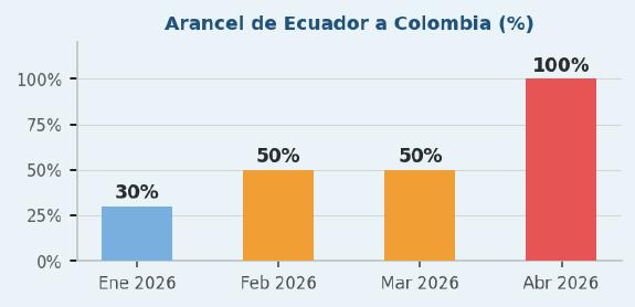 Oct 2024 - Cumbre Galapagos: maxima cordialidad bilateral Dic 2025 - EE.UU. opera en Manta. Noboa consolida alianza con Trump Ene 2026 - Ecuador impone arancel del 30% por 'seguridad nacional' Feb 2026 - Colombia responde y demanda ante la CAN. Escala al 50% Abr 2026 - 100% de arancel. Petro amenaza salir de la CAN. Crisis máxima