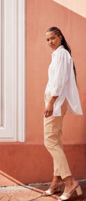 01 | 02 | 04 | 01 | Koszula oversized z plisą guzikową 7999 03 | Spodnie bojówki 10999 02 | Top w prążek z tyłem typu bokserka, z bawełny organicznej 3999 04 | Klapki 10999