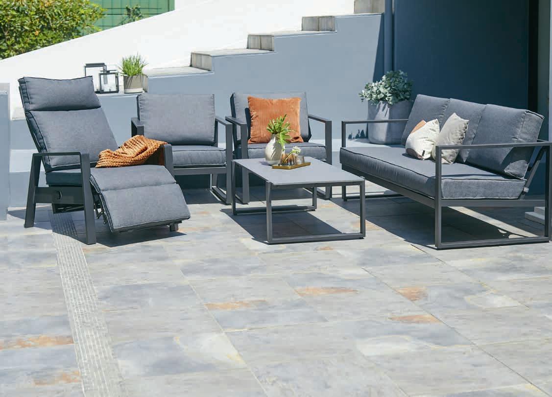 Stół: Aluminium i kamień spiekany. S64 x D130 x W39 cm 3-seater sofa i Krzesło: Aluminium. W zestawie luksusowe poduszki z wytrzymałym, strukturalnym pokrowcem. ZESTAW