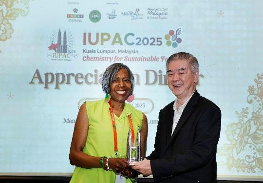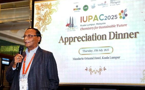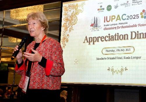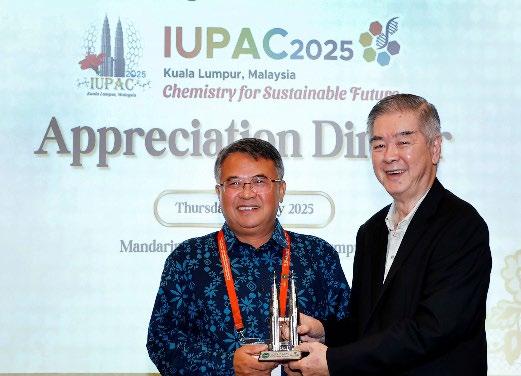 On 17 July 2025, the Institut Kimia Malaysia (IKM) hosted the IUPAC 2025 Appreciation Dinner at the Mandarin Oriental Hotel, Kuala Lumpur, to honour the invaluable contributions of those who made the congress a success. The evening was a heartfelt occasion to recognise the unwavering support of the organising committee, IUPAC Council and officers, plenary and invited speakers, sponsors, partners, and collaborators who played a key role in bringing the global chemistry com munity together.