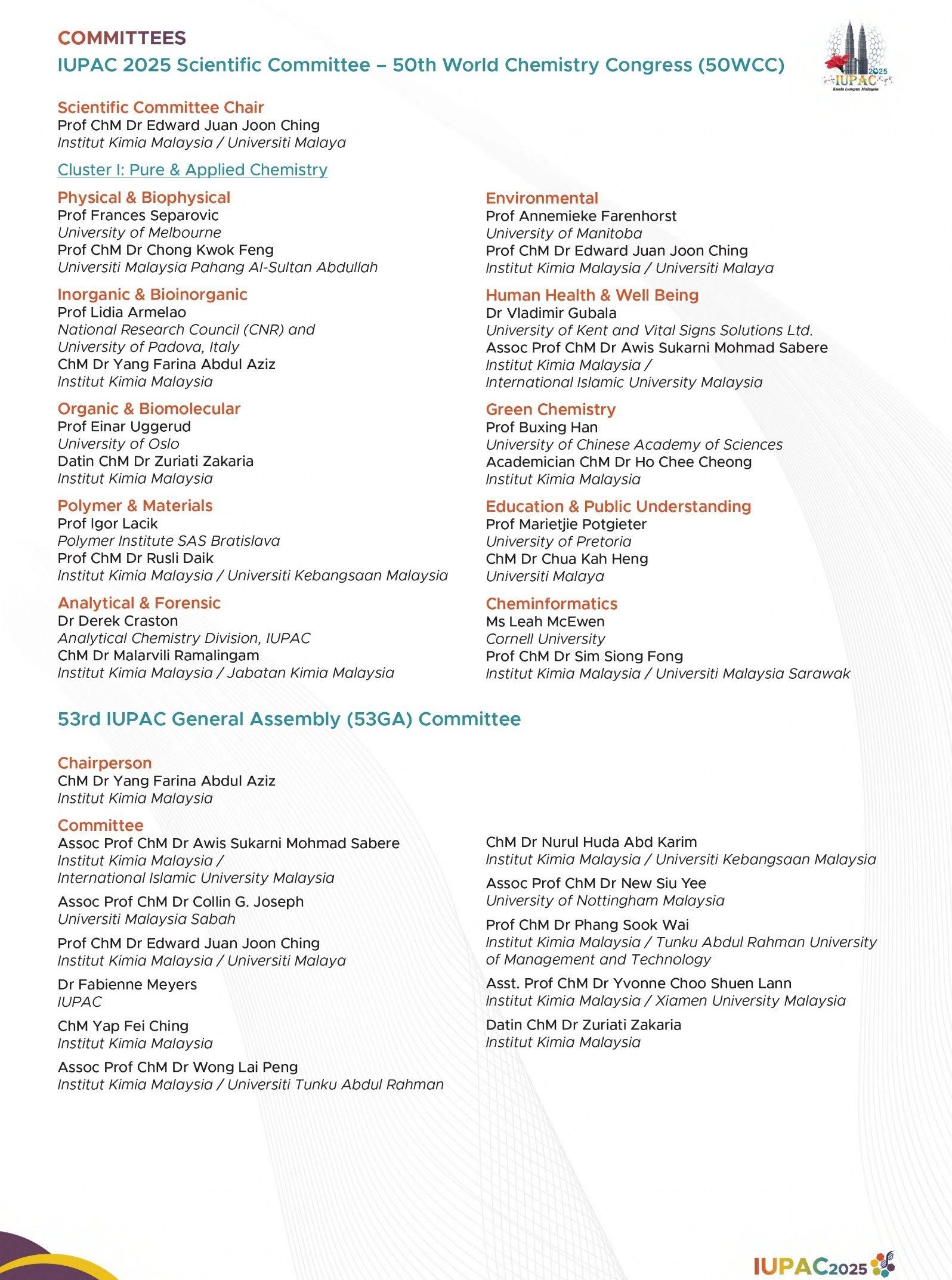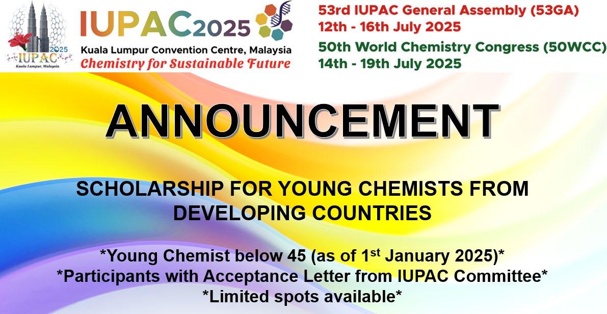 The 50 th World Chemistry Congress (50WCC) and the 53 rd IUPAC General Assembly (53GA) were successfully held at the Kuala Lumpur Convention Centre, Malaysia, marking the first time these flagship IUPAC events were hosted in an ASEAN country. The gathering drew over 3,000 delegates from across the globe (95 countries), reflecting the strong international stature of the congress. The 53 rd General Assembly took place from 12 – 16 July 2025, followed by the 50 th World Chemistry Congress from 14 – 19 July 2025.