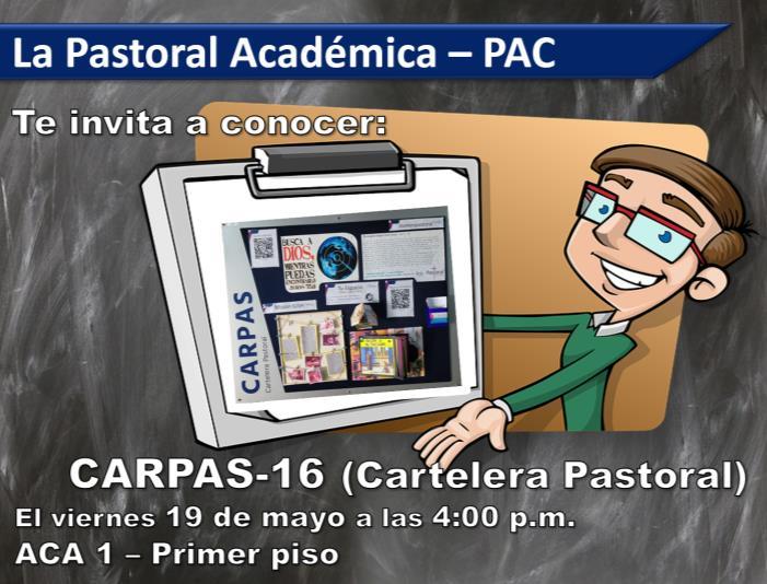Esta sección del Boletín Pastoral pertenece a la Dirección de Pastoral (DIPA), la cual extiende la invitación a la comunidad universitaria a participar de las actividades propias de las diferentes pastorales. Por lo tanto, les recordamos que durante las próximas semanas estaremos llevando a cabo las siguientes actividades.