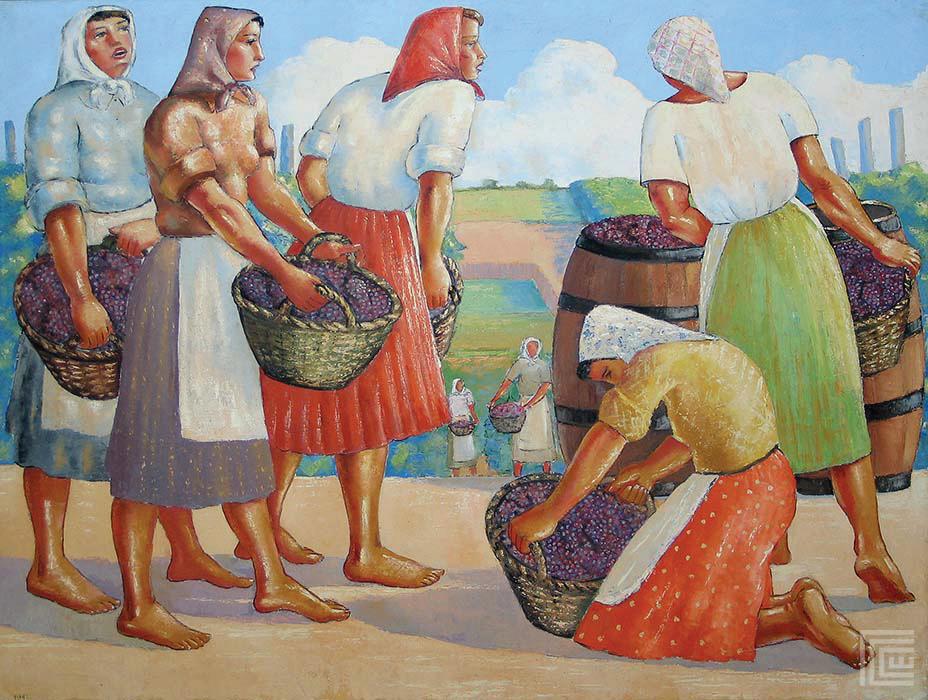 На слици Берачице са корпама грожђа приказане су жене које беру грожђе. Сазнај у које доба године људи беру грожђе. Размисли зашто је сликару било занимљиво да наслика овај догађај. Опиши шта све на слици видиш. Запази боје које је сликар употребио. Какво расположење слика у теби изазива?