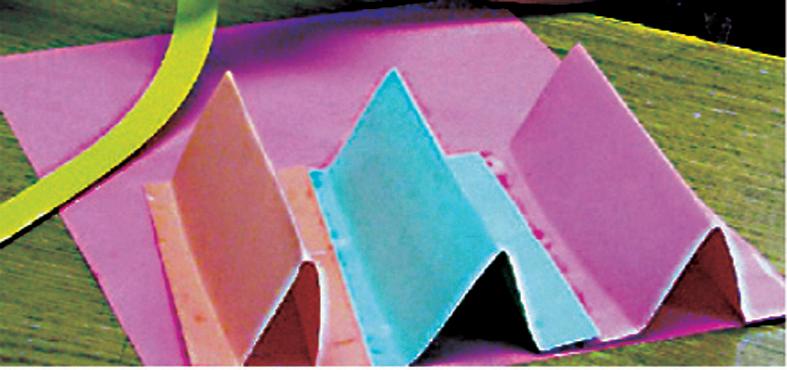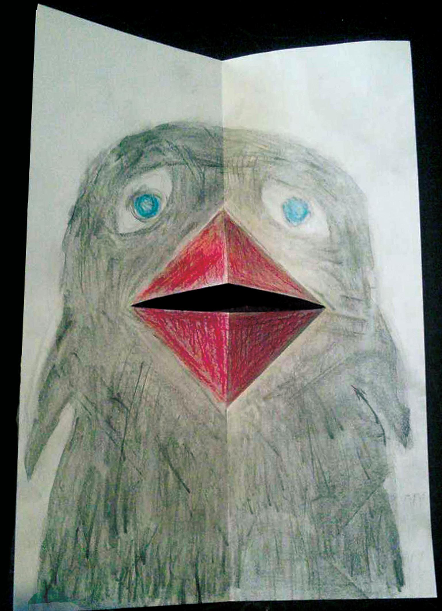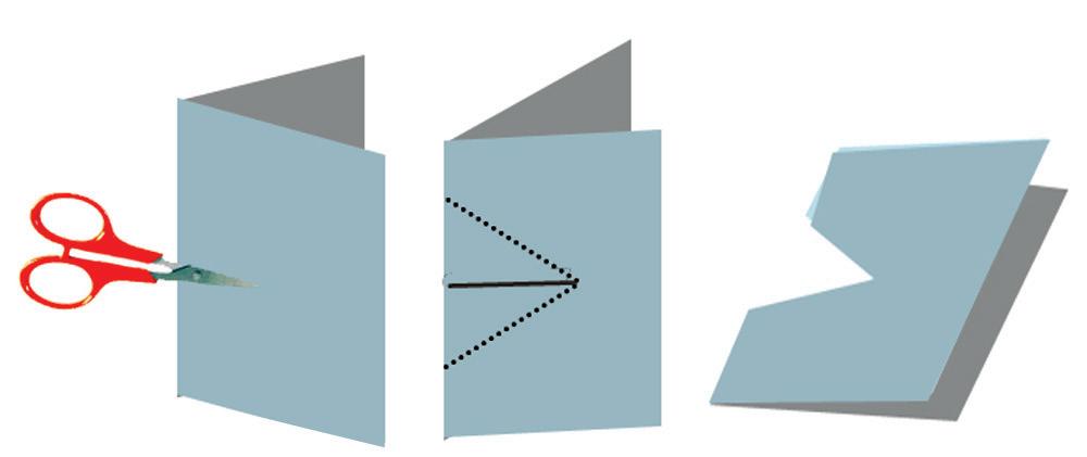 Лист из блока можеш обликовати на следеће начине: савијањем, засецањем, лепљењем, гужвањем. Испод текста су приказани примери за неке начине обликовања. Израђене облике можеш обојити фломастерима, воштаним бојама, темперама. Пресавиј лист напола, маказама засеци приказану линију. Затим троуглове савиј према унутрашњости, као што је приказано на слици. Са унутрашње стране добићеш испупчени кљун. Засецањем папира могу се створити још неке занимљиве целине.