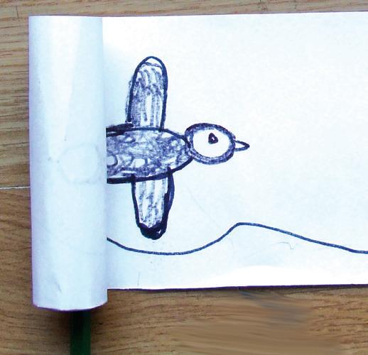 Направи цртани филм. Покрете можеш да прикажеш на једноставан начин. Узми папир и пресеци га по ширини на два дела. Нацртај нешто (на пример отворено око). Затим поново нацртај мало промењен цртеж (на пример затворено око). Траку намотај на оловку. Брзо повлачећи оловку лево-десно оживи свој цртеж. У овом примеру видећеш час отворено, час затворено око. На сликама доле птица ће летети. Ево још идеја: дрво се њише на ветру; лептир у лету; птица у кавезу – кавез без птице.