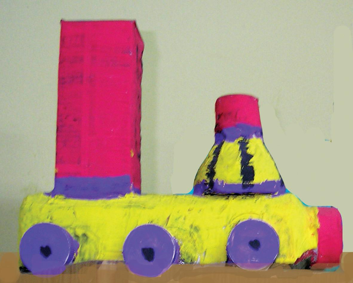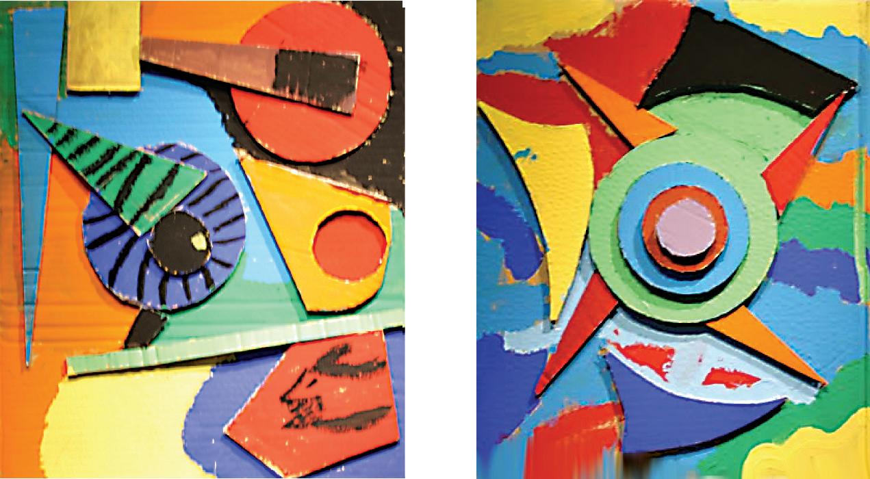 Уз помоћ картонске кутије можеш направити занимљиво уметничко дело. На приложеним примерима ученици су користили картонске кутије, од којих су исецали слободне и правилне геометријске облике. Затим су облике обојили јарким бојама. Поједине делове су залепили један на други. Добили су тако различита испупчења.