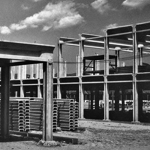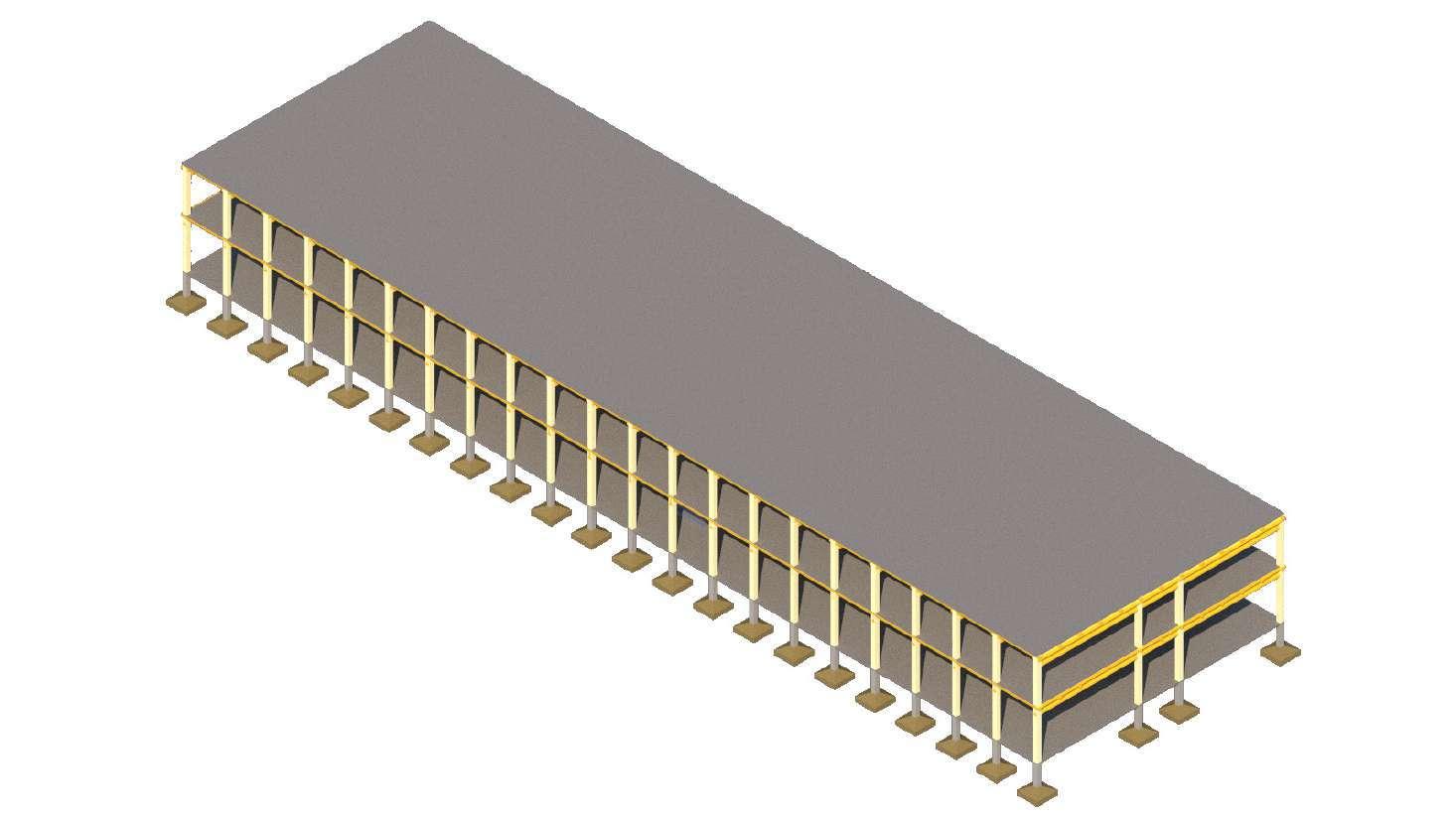 A fundação e embasamento são feitos em concreto armado moldado in loco, já as vigas e pilares são em concreto armado pré-moldado, assim como as placas de composição da coberta;