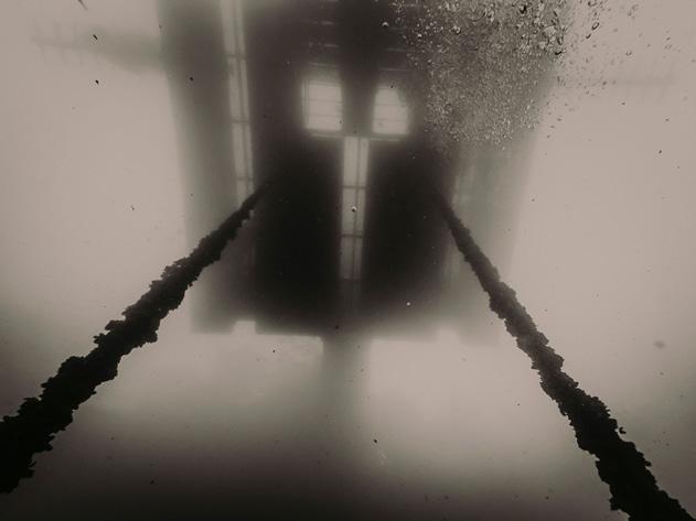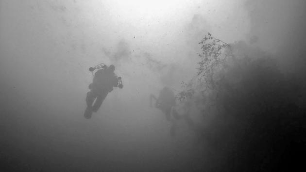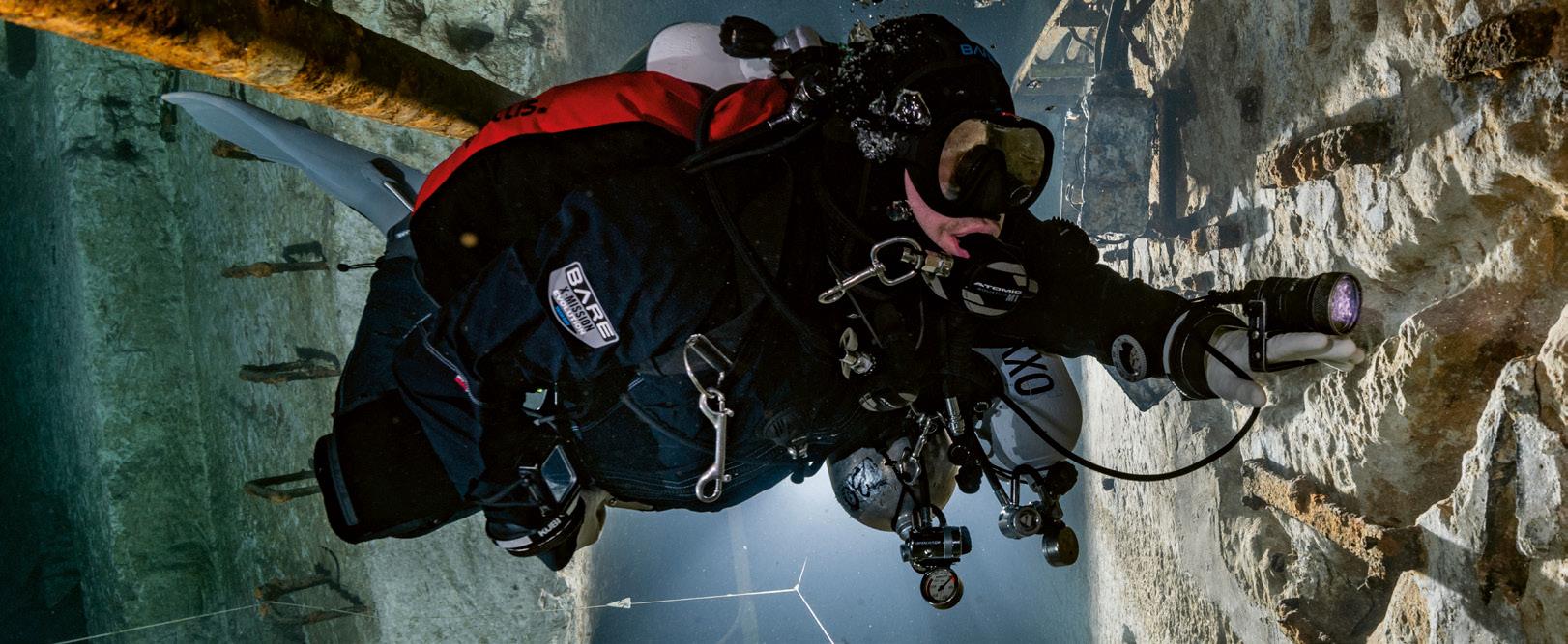 Coverfoto: Droogpakduiker in de steengroeve 'de Barges'. Camera: Nikon 7100, ISO 200, 1/250 sec. bij f/16. Lens: Nikkor 16 mm F/2.8 D Fisheye. Foto: Peter Ryngaert. Buddy/model Katia Callewaert.
