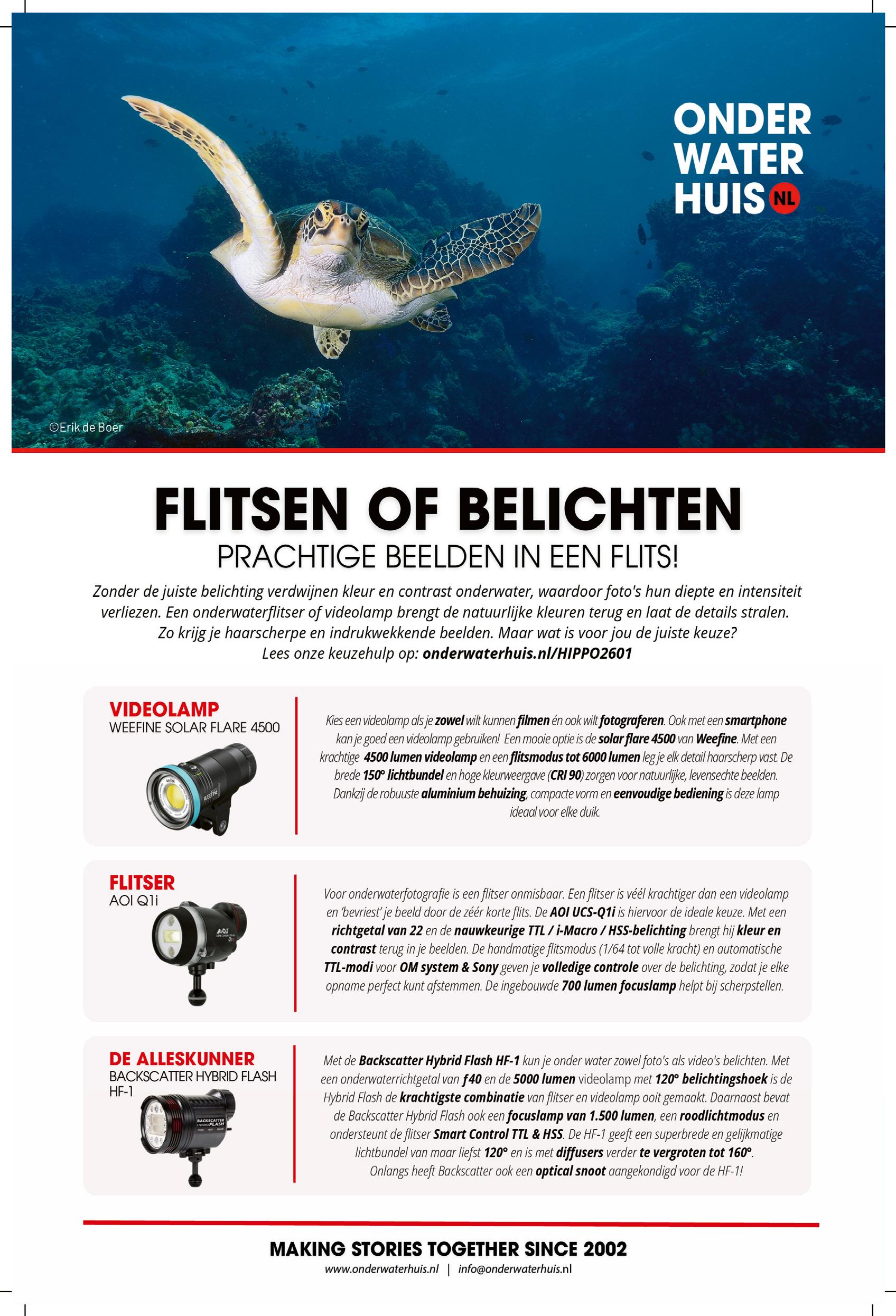 In het begin van het jaar staan traditioneel heel wat duikbeurzen op de kalender en dat gaat steevast gepaard met nieuw duikmateriaal. We verzamelden een aantal nieuwe snufjes en brengen een verslag van ons bezoek aan de fabriek van Camaro in Oostenrijk, waar we ook zelf een aantal pakken konden testen. We gingen daarnaast ook onder water met de MFO-3 Nauticam, het nieuwe speeltje voor de onderwatermacrofotografen. Kocht je een duikbril, lees dan zeker even hoe je ervoor kan zorgen dat hij niet beslaat.