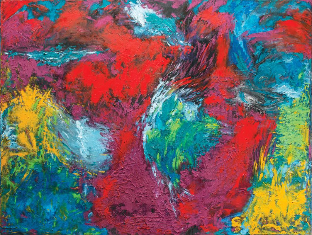Within the exhibition named Jazz Baroque in Lucida gallery, Vučinić displays before the audiences six oil paintings of large dimensions, made in the style of Abstract Expressionism. Colour is the key element of composition - swirling masses of blue and red, black, yellow, purple, orange and green colour braid on Vučinić 's canvases. Painter Macdonald-Wright noted that "... as nature recedes from the eye it becomes blue-violet