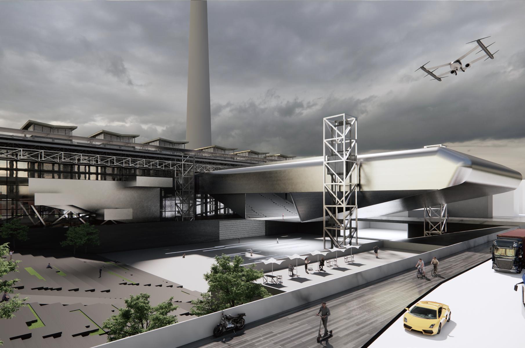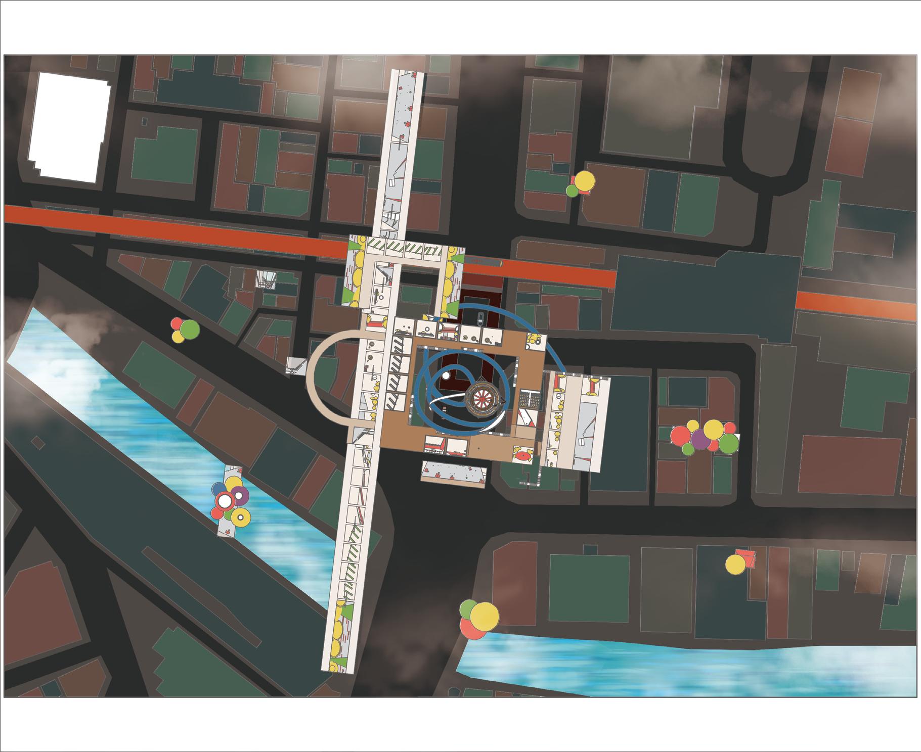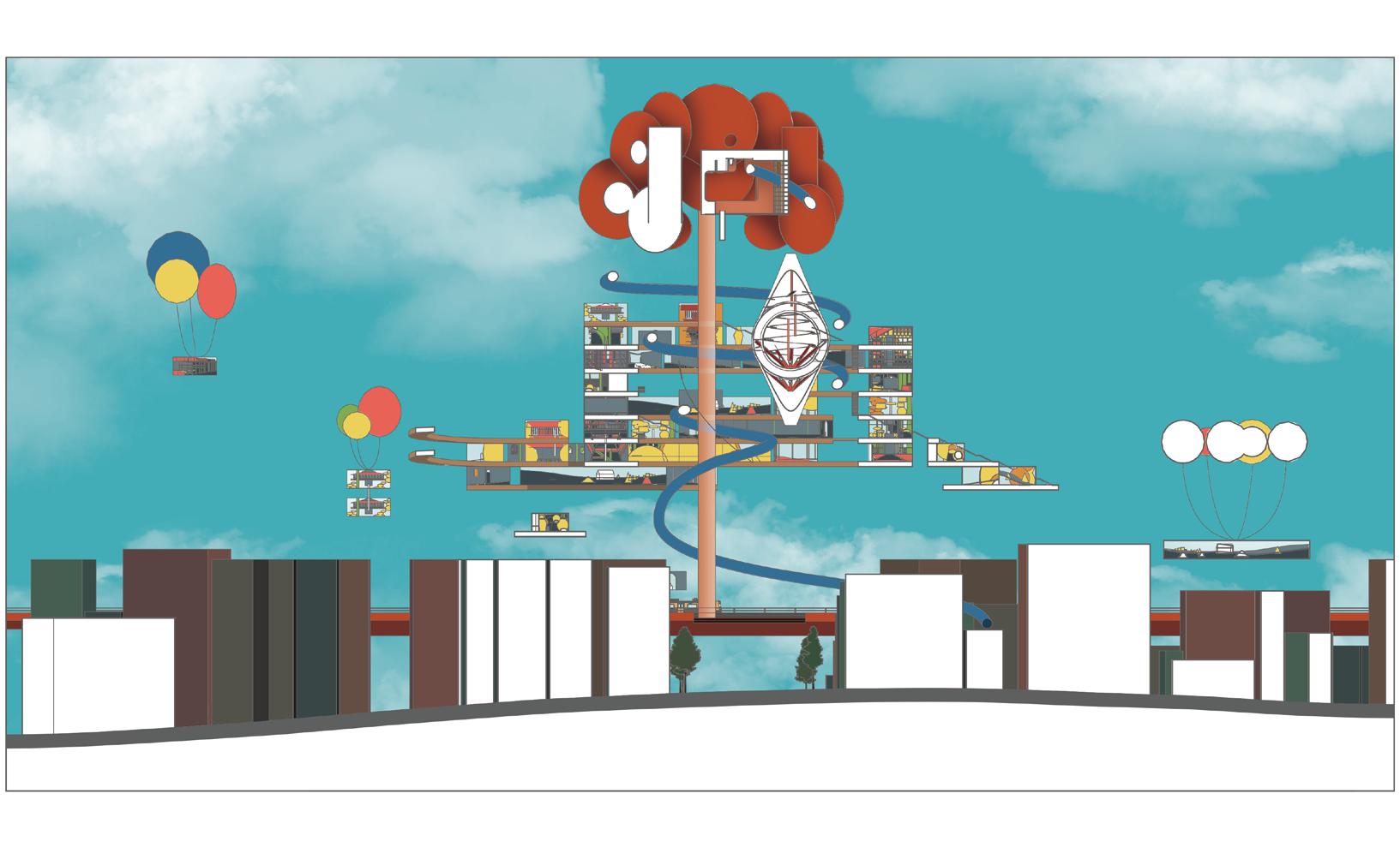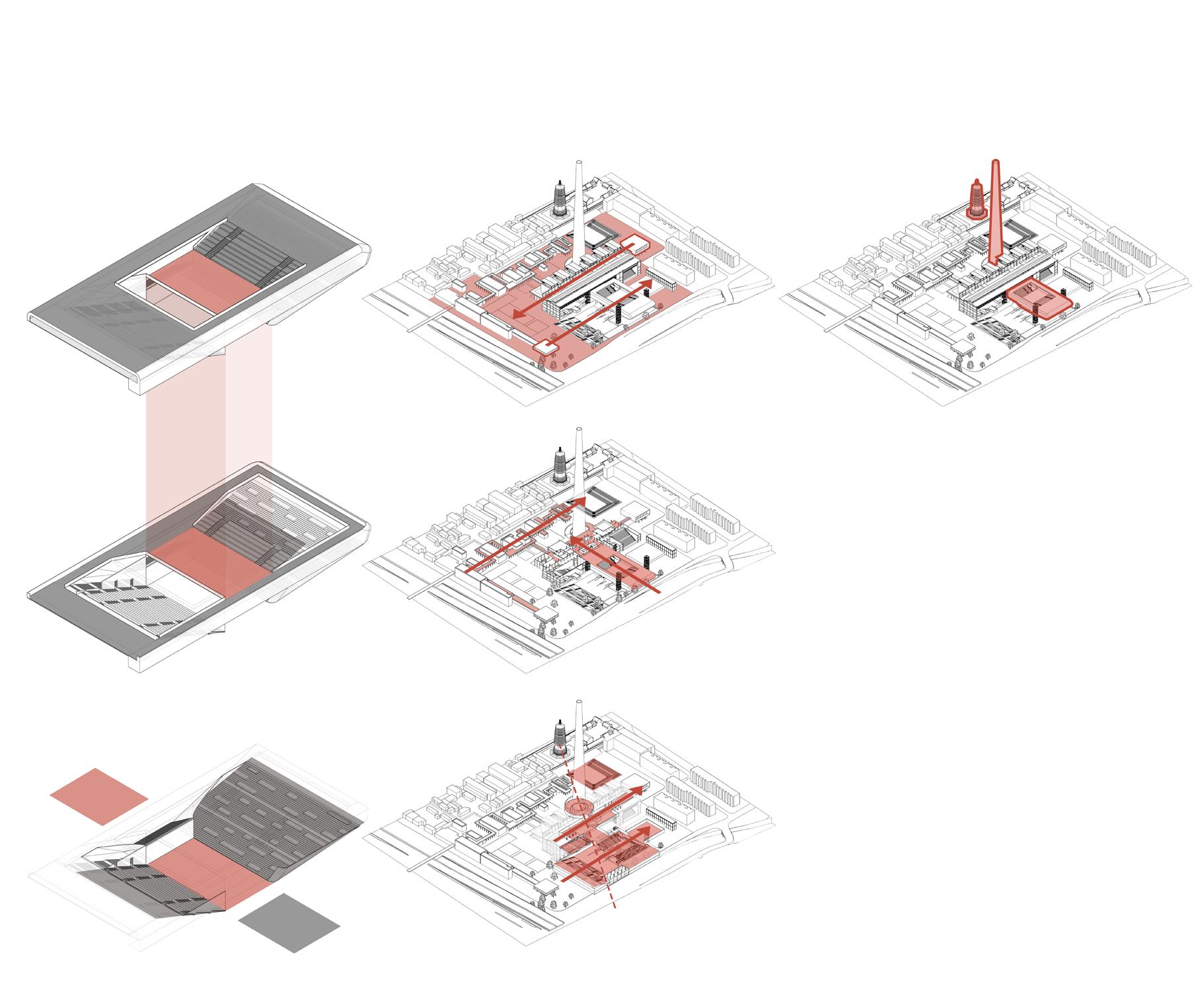 An urban installation with function is inserted to the industrial park. The Specta-craft not only is a theater itself, but it also changes how other stages are used when the spacecraft lands or hovers. The change in the skeleton of the industrial park is catalyzed by the vertical movement of the Specta-craft.