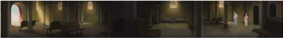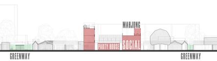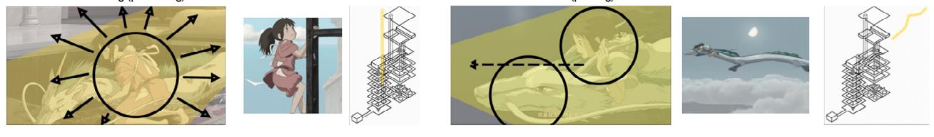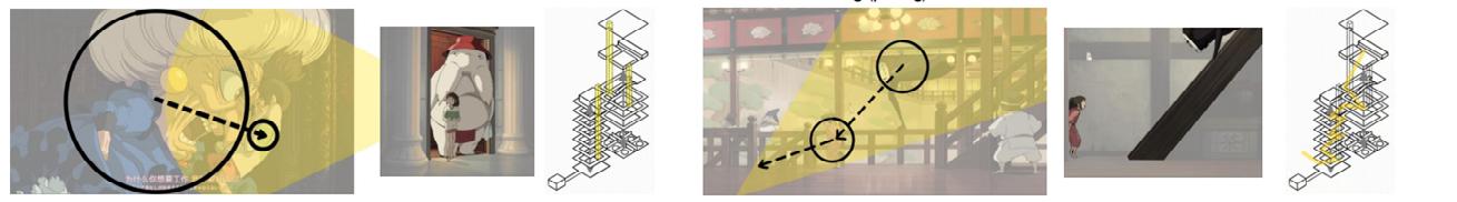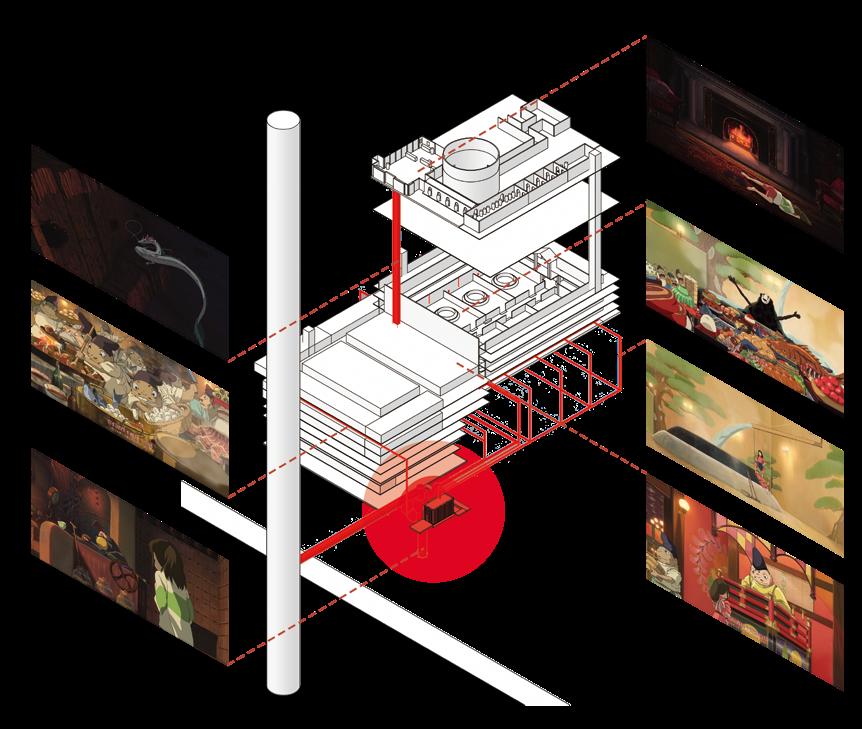 The first tower is composed of two parts, the cloud engine and the spiritual locus, both derived from the spatial movement around the "Yu" bathhouse, the main stage of the film. The cloud engine represented the boiler house, where characters received warmth, care and growth. The spiritual locus tracked different styles of vertical movement in the film, inside and outside the bathhouse.