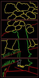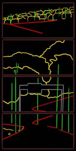 The second tower is a representation of the pop-up stories inside the film. This is derived from the spatial structure of storyboard, where the next box may be unpredictable. Groups of fragments are dismantled from shots of camera movement. In each vertical moving footage, the films are broken into four boxes of fragments. Twelve towers of vertical fragments are created.