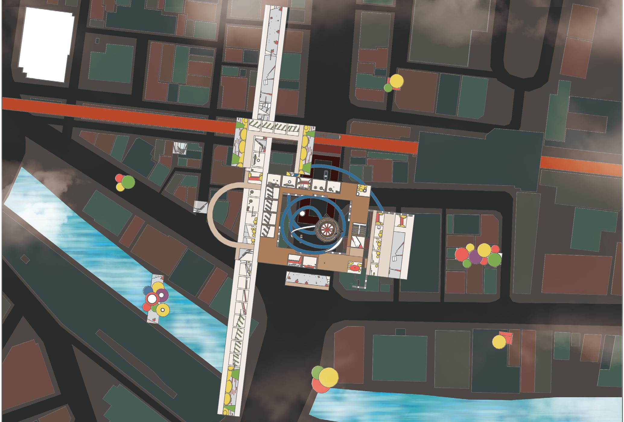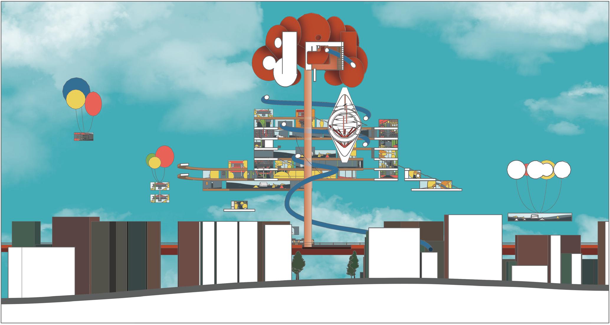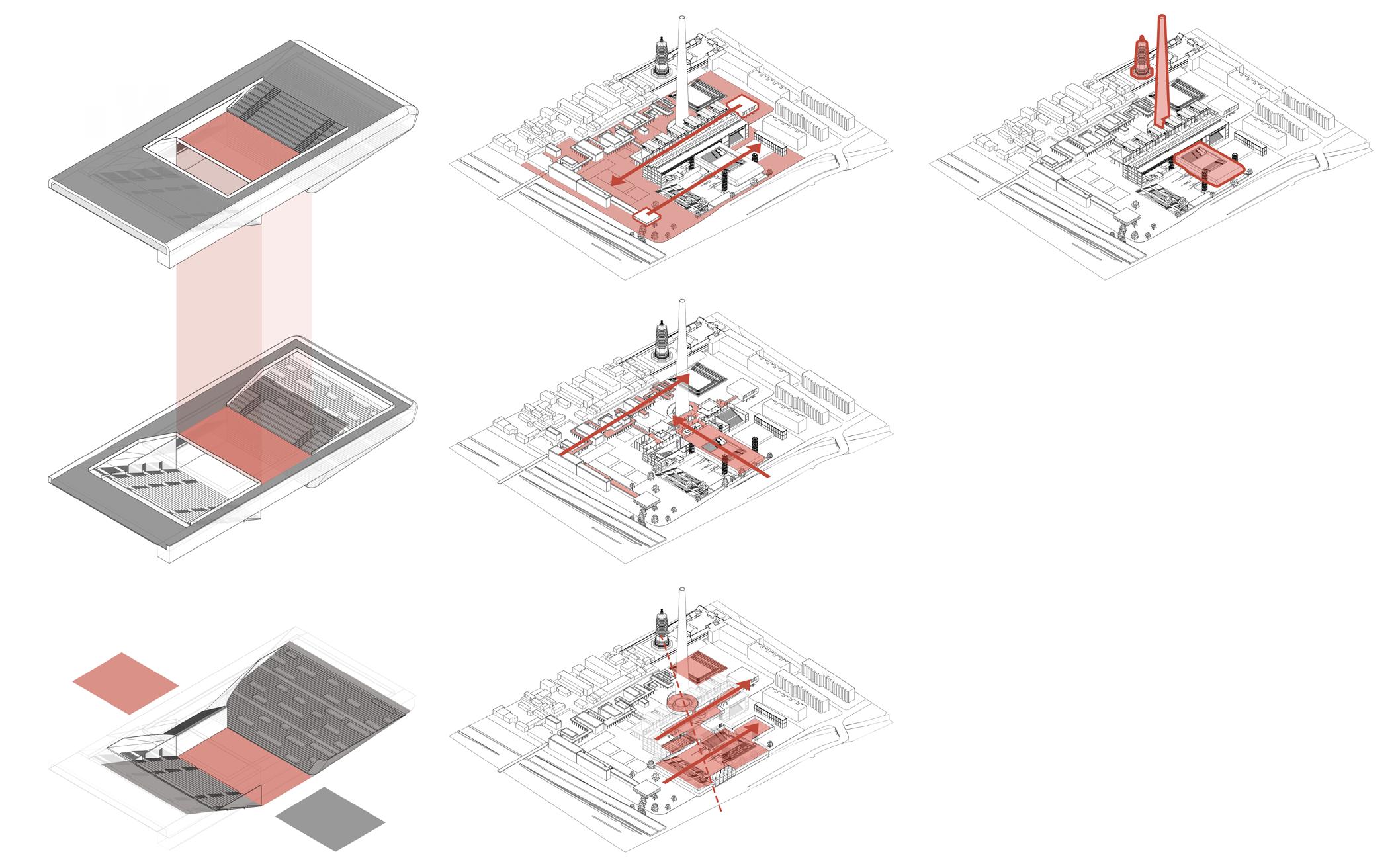 An urban installation with function is inserted to the industrial park. The Specta-craft not only is a theater itself, but it also changes how other stages are used when the spacecraft lands or hovers. The change in the skeleton of the industrial park is catalyzed by the vertical movement of the Specta-craft. PERFORMANCE VIEWING