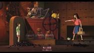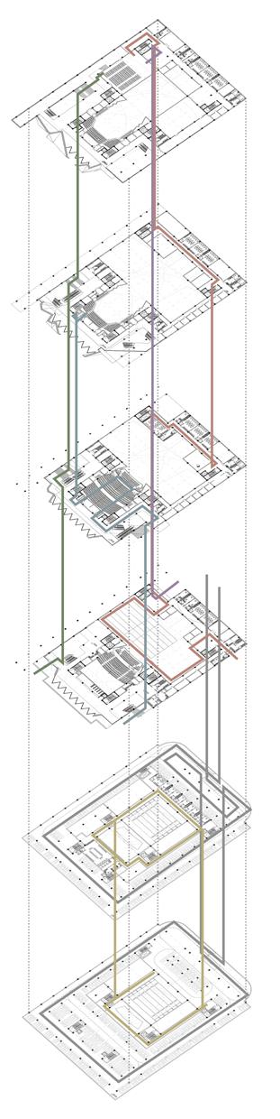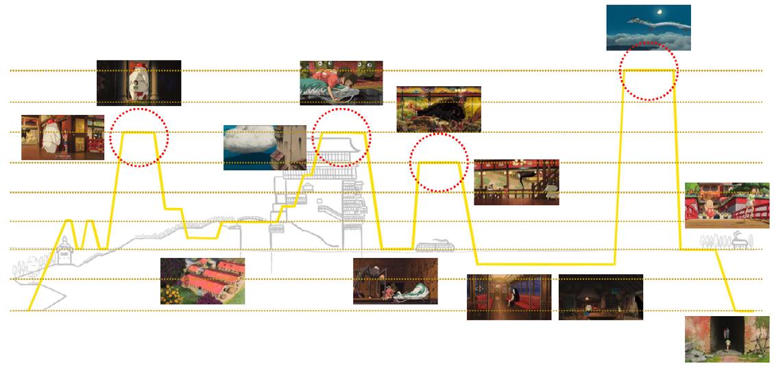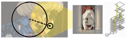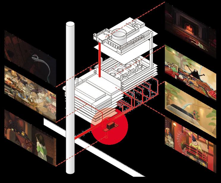 The first tower is composed of two parts, the cloud engine and the spiritual locus, both derived from the spatial movement around the "Yu" bathhouse, the main stage of the film. The cloud engine represented the boiler house, where characters received warmth, care and growth. The spiritual locus tracked different styles of vertical movement in the film, inside and outside the bathhouse.
