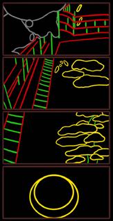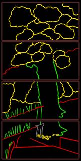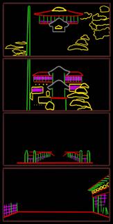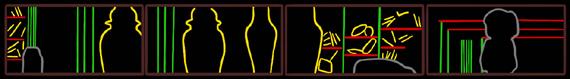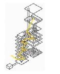 The second tower is a representation of the pop-up stories inside the film. This is derived from the spatial structure of storyboard, where the next box may be unpredictable. Groups of fragments are dismantled from shots of camera movement. In each vertical moving footage, the films are broken into four boxes of fragments. Twelve towers of vertical fragments are created.
