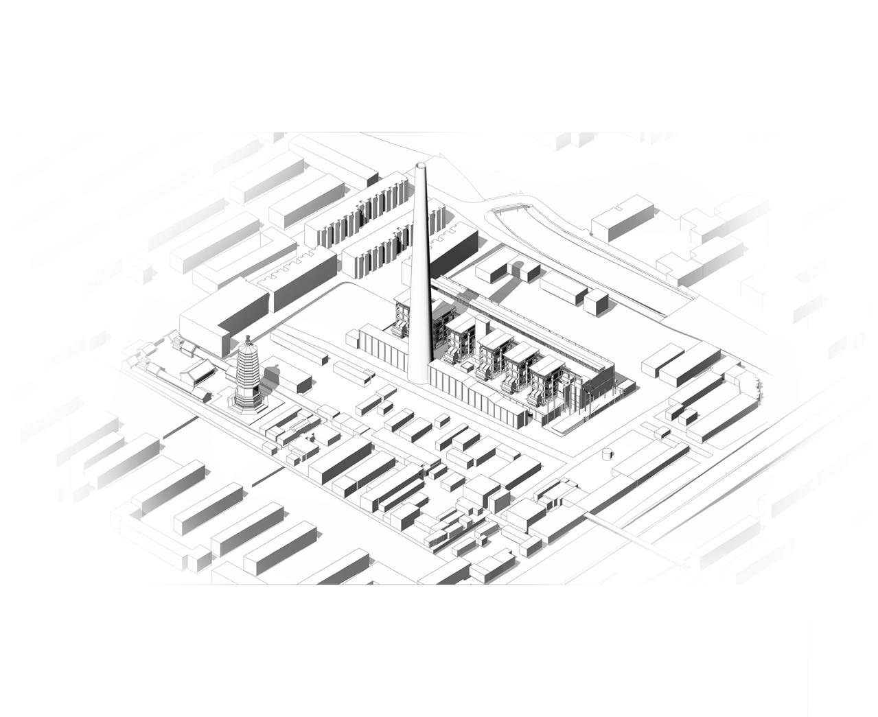 History of the old Beijing has precipitated hundreds of years of culture and industrial progress. In the western edge of the Beijing City Wall, the Second Thermal Power Plant is a monument of the industrial age. Right next to it is the TianNing Temple Tower, a Buddhist temple built in the Northern Wei Dynasty. The TianNing Temple Tower and the chimney of the thermal power complex are two symbols of different eras of the city--the traditional and the industrial. What is to be inserted to the complex would be a symbol of the present, or even the future. The Specta-craft creates two systems, which catalyze the longitudinal and the latitudinal structure of the zone respectively. The systems changes when the spacecraft takes flight or anchors.