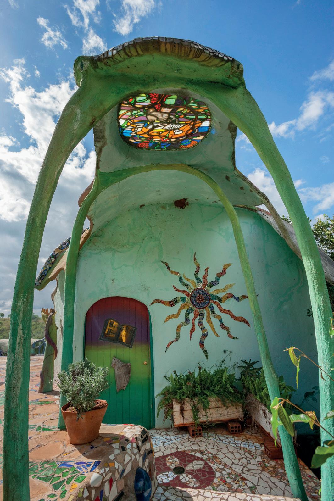 Her imagination and inspiration from the wildlife she so loves is evident in sculpture and murals – her braai, the jaws of a dragon, her pool filled with the humps of a mythical sea creature. Up above the hot African dirt, bridges and wrought iron staircases lead to stilted studies and breathtaking balconies. Concrete and brilliant slabs of glass create tunnels and arches overhead and brightly painted wooden doorways lead from one dream world garden to another.