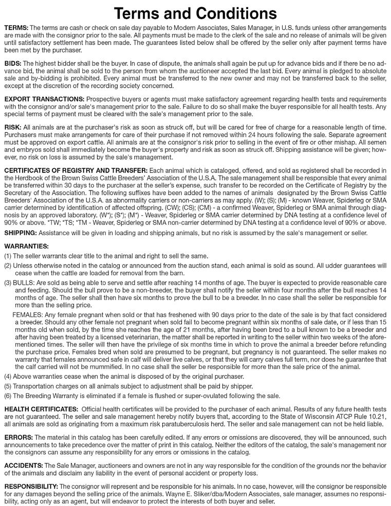 TERMS OF SALE are payment in full on sale day by cash or good check unless prior written arrangements have been made with sale management. For buyers not in attendance, full payment for purchases is due to sale manager within 5 business days of the sale. Any special terms must have prior approval by sale management.