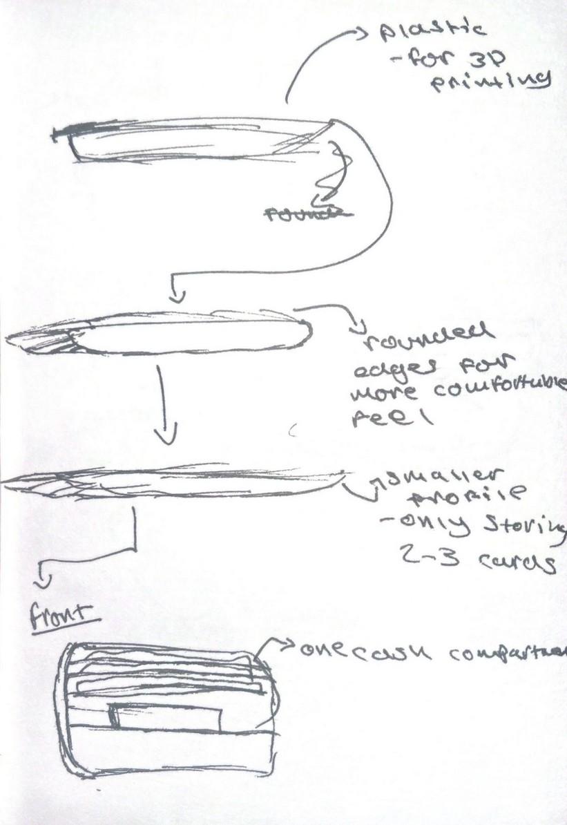 4. This is my 3D printed prototype. This failed due to having wrong measurements in terms of the spacers between the card slots, which collapsed during printing, additionally I think the wallet was shrunk to fit better amongst other prints, making it too small to fit any cards